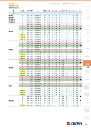 Oversized h stock standard, ) check stock EU, f check stock JP, m stock exhaustion Old Code New Code M TCTR Ø Hole Ø(tolerance)(mm)(mm)CodeTHCHT(chamfer)LF(mm)THL(mm) LU(mm) LS DCON K(mm)(mm)(mm)LK(mm)NOFTypeStock Intro JIS M2X0.4 P2 1.6 1.65 POFQ2.0EL07 5P 70 7.2 15 52 3 2.5 5 3 011 f M2.3X0.4 P2 1.9 1.95 POFQ2.3EL07 5P 70 7.2 15 52 3 2.5 5 3 011 f SP M2.5X0.45 P2 2.1 2.11 POFQ2.5FL07 5P 70 8.1 15 52 3 2.5 5 3 011 f M2.6X0.45 P2 2.2 2.21 POFQ2.6FL07 5P 70 8.1 15 52 3 2.5 5 3 011 f P2 2.5 2.56 POFQ3.0GL07 5P 70 9 18 46 4 3.2 6 3 011 f P2 2.5 2.56 POQ3.0GL10 5P 100 9 14 40 4 3.2 6 3 011 m SL P2 2.5 2.56 POFQ3.0GL10 5P 100 9 18 40 4 3.2 6 3 011 h P2 2.5 2.56 POFQ3.0GL12 5P 120 9 18 40 4 3.2 6 3 011 f M3X0.5 P2 2.5 2.56 POFQ3.0GL15 5P 150 9 18 40 4 3.2 6 3 011 f PO P3(P2+15) 2.5 2.56 POFR3.0GL10 5P 100 9 18 40 4 3.2 6 3 011 f P4(P2+30) 2.5 2.56 POFS3.0GL10 5P 100 9 18 40 4 3.2 6 3 011 f P3(P2+15) 2.5 2.56 POFR3.0GL15 5P 150 9 18 40 4 3.2 6 3 011 f P2 3.3 3.38 POFQ4.0IL07 5P 70 11 21 43 5 4 7 3 011 f ST P2 3.3 3.38 POQ4.0IL10 5P 100 11 17 40 5 4 7 3 011 m P2 3.3 3.38 POFQ4.0IL10 5P 100 11 21 40 5 4 7 3 011 h P2 3.3 3.38 POFQ4.0IL12 5P 120 11 21 40 5 4 7 3 011 f M4X0.7 P2 3.3 3.38 POQ4.0IL15 5P 150 11 17 40 5 4 7 3 011 m ROLL P2 3.3 3.38 POFQ4.0IL15 5P 150 11 21 40 5 4 7 3 011 h P3(P2+20) 3.3 3.38 POFR4.0IL10 5P 100 11 21 40 5 4 7 3 011 f P4(P2+40) 3.3 3.38 POFS4.0IL10 5P 100 11 21 40 5 4 7 3 011 f CARBIDE P3(P2+20) 3.3 3.38 POFR4.0IL15 5P 150 11 21 40 5 4 7 3 011 f P2 4.2 4.28 POQ5.0KL10 5P 100 13 22 40 5.5 4.5 7 3 011 m P2 4.2 4.28 POFQ5.0KL10 5P 100 13 25 40 5.5 4.5 7 3 011 h P2 4.2 4.28 POFQ5.0KL12 5P 120 13 25 40 5.5 4.5 7 3 011 f LONG M5X0.8 P2 4.2 4.28 POQ5.0KL15 5P 150 13 22 40 5.5 4.5 7 3 011 m JIS P2 4.2 4.28 POFQ5.0KL15 5P 150 13 25 40 5.5 4.5 7 3 011 h P3(P2+20) 4.2 4.28 POFR5.0KL10 5P 100 13 25 40 5.5 4.5 7 3 011 f HAND P3(P2+20) 4.2 4.28 POFR5.0KL15 5P 150 13 25 40 5.5 4.5 7 3 011 f TAPS P4(P2+40) 4.2 4.28 POFS5.0KL15 5P 150 13 25 40 5.5 4.5 7 3 011 f P2 5 5.09 POQ6.0ML10 5P 100 15 26 40 6 4.5 7 3 011 m P2 5 5.09 POFQ6.0ML10 5P 100 15 30 40 6 4.5 7 3 011 h EG (STI) P2 5 5.09 POFQ6.0ML12 5P 120 15 30 40 6 4.5 7 3 011 f P2 5 5.09 POQ6.0ML15 5P 150 15 26 40 6 4.5 7 3 011 m M6X1 P2 5 5.09 POFQ6.0ML15 5P 150 15 30 40 6 4.5 7 3 011 h SPECIAL P2 5 5.09 POFQ6.0ML20 5P 200 15 30 40 6 4.5 7 3 011 f THREADS,GAUGES P3(P2+20) 5 5.09 POFR6.0ML10 5P 100 15 30 40 6 4.5 7 3 011 f P3(P2+20) 5 5.09 POFR6.0ML15 5P 150 15 30 40 6 4.5 7 3 011 f P4(P2+40) 5 5.09 POFS6.0ML15 5P 150 15 30 40 6 4.5 7 3 011 f THREAD P3 6.8 6.85 POR8.0NL10 5P 100 19 - 50 6.2 5 8 3 013 h MILLS P3 6.8 6.85 POR8.0NL12 5P 120 19 - 50 6.2 5 8 3 013 f M8X1.25 P3 6.8 6.85 POR8.0NL15 5P 150 19 - 50 6.2 5 8 3 013 h P3 6.8 6.85 POR8.0NL20 5P 200 19 - 50 6.2 5 8 3 013 f DIES P4(P3+20) 6.8 6.85 POS8.0NL15 5P 150 19 - 50 6.2 5 8 3 013 f CENTER DRILLS Technical info 459