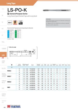Long Taps Intro LS-PO-K GP General Purpose Series SP Long Shank Spiral Pointed Taps with Long Neck FEATURES SL HSS-E 4.5PTHCHT Long shank general purpose for extended overhang onthrough hole application.For tapping steel, also suitable for non-ferrous materials. Reduced neck for deep holes. PO Recommended Tapping Speeds Depending On Materials ISO Vc (m/min) ISO Vc (m/min) P1 5÷10 I N1 5÷10 I P2 5÷10 H N2 5÷10 I ST P3 5÷10 I N3 5÷10 I P4 5÷8 I N4 5÷10 I H 1st choice I suitable ROLL JIS-LS-PO-K TYPE: PO_099 CARBIDE K DCON LONG THL LU LKLS KLF JIS HAND TAPS M TCTR Ø Hole Ø(tolerance)(mm)(mm)CodeTHCHT(chamfer)LF(mm)THL(mm) LU(mm) LS DCON K(mm)(mm)(mm)LK(mm)NOFType Stock JIS EG (STI) P2 2.5 2.56 PY3.0GQFEBE 4.5P 100 9 28 40 4 3.2 6 3 099 f M3X0.5 P2 2.5 2.56 PY3.0GQFEBF 4.5P 120 9 28 40 4 3.2 6 3 099 f P2 2.5 2.56 PY3.0GQFEBG 4.5P 150 9 28 40 4 3.2 6 3 099 f SPECIALTHREADS, P2 3.3 3.38 PY4.0IQFEBE 4.5P 100 11 31 40 5 4 7 3 099 f GAUGES M4X0.7 P2 3.3 3.38 PY4.0IQFEBF 4.5P 120 11 31 40 5 4 7 3 099 f P2 3.3 3.38 PY4.0IQFEBG 4.5P 150 11 31 40 5 4 7 3 099 f THREAD P2 4.2 4.28 PY5.0KQFEBE 4.5P 100 13 38 40 5.5 4.5 7 3 099 f MILLS M5X0.8 P2 4.2 4.28 PY5.0KQFEBF 4.5P 120 13 38 40 5.5 4.5 7 3 099 f P2 4.2 4.28 PY5.0KQFEBG 4.5P 150 13 38 40 5.5 4.5 7 3 099 f P2 5 5.09 PY6.0MQFEBE 4.5P 100 15 45 40 6 4.5 7 3 099 f DIES M6X1 P2 5 5.09 PY6.0MQFEBF 4.5P 120 15 45 40 6 4.5 7 3 099 fP255.09PY6.0MQFEBG4.5P15015454064.573099f CENTER DRILLS Technical info 464