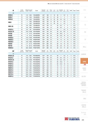 h stock standard, ) check stock EU, f check stock JP, m stock exhaustion M TCTR Ø Hole Ø(tolerance)(mm)(mm)CodeTHCHT(chamfer)LF(mm)THL(mm) LU(mm) LS DCON K(mm)(mm)(mm)LK(mm)NOFTypeStock Intro JIS M3X0.5 P3 2.5 2.56 P43.0GRDPBE 5.5P 100 9 18 40 4 3.2 6 3 011 f M4X0.7 P3 3.3 3.38 P44.0IRDPBE 5.5P 100 11 21 40 5 4 7 3 011 f SP M5X0.8 P3 4.2 4.28 P45.0KRDPBE 5.5P 100 13 25 40 5.5 4.5 7 3 011 f P3 5 5.09 P46.0MRDPBE 5.5P 100 15 30 40 6 4.5 7 3 011 f M6X1 P3 5 5.09 P46.0MRDPBG 5.5P 150 15 30 40 6 4.5 7 3 011 f P4 6.8 6.85 PY8.0NSDPBE 5.5P 100 19 - 50 6.2 5 8 3 013 f SL M8X1.25 P4 6.8 6.85 PY8.0NSDPBG 5.5P 150 19 - 50 6.2 5 8 3 013 f M10X1.5 P4 8.5 8.6 PY010OSDPBG 5.5P 150 23 - 50 7 5.5 8 3 013 f M12X1.75 P4 10.3 10.36 PY012PSDPBG 5.5P 150 26 - 50 8.5 6.5 9 3 013 f PO M14X2 P5 12 12.12 PY014QTDPBG 5.5P 150 26 - 60 10.5 8 11 3 013 f M16X2 P5 14 14.12 PY016QTDPBG 5.5P 150 26 - 60 12.5 10 13 3 013 f M18X2.5 P5 15.5 15.63 PY018RTDPBG 5.5P 150 33 - 70 14 11 14 3 013 f M20X2.5 P5 17.5 17.63 PY020RTDPBG 5.5P 150 33 - 70 15 12 15 3 013 f ST M22X2.5 P5 19.5 19.63 PY022RTDPBK 5.5P 200 33 - 70 17 13 16 3 013 f M24X3 P5 21 21.13 PY024STDPBK 5.5P 200 39 - 80 19 15 18 3 013 f M27X3M30X3.5 P5 24 24.13 PY027STDPBK 5.5P 200 39 - 80 20 15 18 4 013 fP526.526.63PY030TTDPBK5.5P20046-802317204013fROLL MF TCTR Ø Hole Ø(tolerance)(mm)(mm)CodeTHCHT(chamfer)LF(mm)THL(mm) LU(mm) LS DCON K(mm)(mm)(mm)LK(mm)NOFTypeStock JIS CARBIDE M10X1.25 P4 8.8 8.85 PY010NSDPBG 5.5P 150 23 - 50 7 5.5 8 3 013 f M12X1.5 P4 10.5 10.6 PY012OSDPBG 5.5P 150 26 - 50 8.5 6.5 9 3 013 f M12X1.25 P4 10.8 10.85 PY012NSDPBG 5.5P 150 26 - 50 8.5 6.5 9 3 013 f M14X1.5 P4 12.5 12.6 PY014OSDPBG 5.5P 150 26 - 60 10.5 8 11 3 013 f LONG M16X1.5 P4 14.5 14.6 PY016OSDPBG 5.5P 150 26 - 60 12.5 10 13 3 013 f JIS M18X1.5 P4 16.5 16.6 PY018OSDPBG 5.5P 150 33 - 70 14 11 14 3 013 f M20X1.5 P4 18.5 18.6 PY020OSDPBG 5.5P 150 33 - 70 15 12 15 3 013 f HAND M22X1.5 P4 20.5 20.6 PY022OSDPBK 5.5P 200 33 - 70 17 13 16 3 013 f TAPS M24X1.5 P4 22.5 22.6 PY024OSDPBK 5.5P 200 39 - 80 19 15 18 3 013 f M27X1.5 P4 25.5 25.6 PY027OSDPBK 5.5P 200 39 - 80 20 15 18 4 013 f M30X1.5 P4 28.5 28.6 PY030OSDPBK 5.5P 200 46 - 80 23 17 20 4 013 f EG (STI) SPECIAL THREADS, GAUGES THREAD MILLS DIES CENTER DRILLS Technical info 469