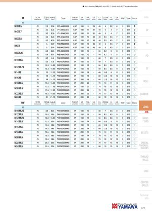 h stock standard, ) check stock EU, f check stock JP, m stock exhaustion M TCTR Ø Hole Ø(tolerance)(mm)(mm)CodeTHCHT(chamfer)LF(mm)THL(mm) LU(mm) LS DCON K(mm)(mm)(mm)LK(mm)NOFTypeStock Intro JIS M3X0.5 P2 2.5 2.56 PY3.0GQGEXES 4.5P 100 9 28 40 4 3.2 6 3 011 ) M4X0.7 P2 3.3 3.38 PY4.0IQGEXES 4.5P 100 11 31 40 5 4 7 3 011 ) SP P2 3.3 3.38 PY4.0IQGEXGS 4.5P 150 11 31 40 5 4 7 3 011 ) P2 4.2 4.28 PY5.0KQGEXES 4.5P 100 13 38 40 5.5 4.5 7 3 011 ) M5X0.8 P2 4.2 4.28 PY5.0KQGEXGS 4.5P 150 13 38 40 5.5 4.5 7 3 011 ) P2 5 5.09 PY6.0MQGEXES 4.5P 100 15 45 40 6 4.5 7 3 011 ) SL M6X1 P2 5 5.09 PY6.0MQGEXGS 4.5P 150 15 45 40 6 4.5 7 3 011 ) P3 6.8 6.85 PY8.0NRGEXES 5P 100 12 - 50 6.2 5 8 3 013 f M8X1.25 P3 6.8 6.85 PY8.0NRGEXGS 5P 150 12 - 50 6.2 5 8 3 013 ) PO P3 8.5 8.6 PY010ORGEXES 5P 100 13 - 50 7 5.5 8 3 013 f M10X1.5 P3 8.5 8.6 PY010ORGEXGS 5P 150 13 - 50 7 5.5 8 3 013 ) P4 10.3 10.36 PY012PSGEXES 5P 100 15 - 50 8.5 6.5 9 3 013 f M12X1.75 P4 10.3 10.36 PY012PSGEXGS 5P 150 15 - 50 8.5 6.5 9 3 013 ) ST M14X2 P4 12 12.12 PY014QSGEXGS 5P 150 18 - 60 10.5 8 11 3 013 f P4 14 14.12 PY016QSGEXGS 5P 150 18 - 60 12.5 10 13 3 013 f M16X2 P4 14 14.12 PY016QSGEXKS 5P 200 18 - 60 12.5 10 13 3 013 f M18X2.5 P4 15.5 15.63 PY018RSGEXKS 5P 200 20 - 70 14 11 14 3 013 f ROLL P4 17.5 17.63 PY020RSGEXGS 5P 150 20 - 70 15 12 15 3 013 f M20X2.5 P4 17.5 17.63 PY020RSGEXKS 5P 200 20 - 70 15 12 15 3 013 f M22X2.5 P4 19.5 19.63 PY022RSGEXKS 5P 200 20 - 70 17 13 16 3 013 f CARBIDE M24X3 P4 21 21.13 PY024SSGEXKS 5P 200 25 - 80 19 15 18 3 013 f MF TCTR Ø Hole Ø(tolerance)(mm)(mm)CodeTHCHT(chamfer)LF(mm)THL(mm) LU(mm) LS DCON K(mm)(mm)(mm)LK(mm)NOFTypeStock JIS LONG M10X1.25 P3 8.8 8.85 PY010NRGEXGS 5P 150 13 - 50 7 5.5 8 3 013 f JIS M12X1.5 P3 10.5 10.6 PY012ORGEXGS 5P 150 15 - 50 8.5 6.5 9 3 013 f M12X1.25 P4 10.8 10.85 PY012NSGEXGS 5P 150 15 - 50 8.5 6.5 9 3 013 f HAND M14X1.5 P3 12.5 12.6 PY014ORGEXGS 5P 150 14 - 60 10.5 8 11 3 013 f TAPS P3 14.5 14.6 PY016ORGEXGS 5P 150 14 - 60 12.5 10 13 3 013 f M16X1.5 P3 14.5 14.6 PY016ORGEXKS 5P 200 14 - 60 12.5 10 13 3 013 f M18X1.5 P4 16.5 16.6 PY018OSGEXKS 5P 200 14 - 70 14 11 14 3 013 f EG (STI) P4 18.5 18.6 PY020OSGEXGS 5P 150 14 - 70 15 12 15 3 013 f M20X1.5 P4 18.5 18.6 PY020OSGEXKS 5P 200 14 - 70 15 12 15 3 013 f M22X1.5 P4 20.5 20.6 PY022OSGEXKS 5P 200 14 - 70 17 13 16 3 013 f SPECIAL M24X1.5 P4 22.5 22.6 PY024OSGEXKS 5P 200 18 - 80 19 15 18 3 013 f THREADS,GAUGES THREAD MILLS DIES CENTER DRILLS Technical info 471