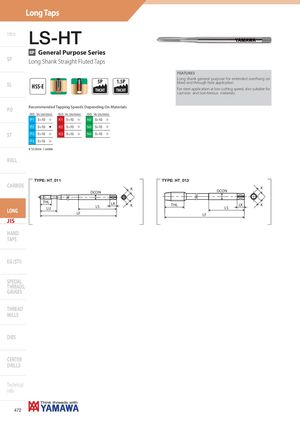 Long Taps Intro LS-HT GP General Purpose Series SP Long Shank Straight Fluted Taps FEATURES SL HSS-E 5P 1.5PTHCHTTHCHT Long shank general purpose for extended overhang onblind and through hole application.For steel application at low cutting speed, also suitable forcast iron and non-ferrous materials. PO Recommended Tapping Speeds Depending On Materials ISO Vc (m/min) ISO Vc (m/min) ISO Vc (m/min) P1 5÷10 I K1 5÷10 I N2 5÷10 I P2 5÷10 H K2 5÷10 I N3 5÷10 I ST P3 5÷10 I K3 5÷10 I N4 5÷10 I P4 5÷10 I H 1st choice I suitable ROLL JIS-LS-HT TYPE: HT_011 TYPE: HT_013 CARBIDE KDCON KDCON THLLONGLU LKLS KLF THL LK KLSLF JIS HAND TAPS EG (STI) SPECIAL THREADS, GAUGES THREAD MILLS DIES CENTER DRILLS Technical info 472