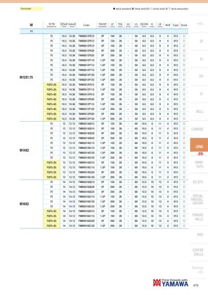 Oversized h stock standard, ) check stock EU, f check stock JP, m stock exhaustion M TCTR Ø Hole Ø(tolerance)(mm)(mm)CodeTHCHT(chamfer)LF(mm)THL(mm) LU(mm) LS DCON K(mm)(mm)(mm)LK(mm)NOFTypeStock Intro JIS P2 10.3 10.36 TNMQ012P510 5P 100 26 - 50 8.5 6.5 9 4 013 f P2 10.3 10.36 TNMQ012P512 5P 120 26 - 50 8.5 6.5 9 4 013 f SP P2 10.3 10.36 TNMQ012P515 5P 150 26 - 50 8.5 6.5 9 4 013 f P2 10.3 10.36 TNMQ012P520 5P 200 26 - 50 8.5 6.5 9 4 013 f P2 10.3 10.36 TNMQ012P525 5P 250 26 - 50 8.5 6.5 9 4 013 f P2 10.3 10.36 TNMQ012P110 1.5P 100 26 - 50 8.5 6.5 9 4 013 f SL P2 10.3 10.36 TNMQ012P112 1.5P 120 26 - 50 8.5 6.5 9 4 013 f P2 10.3 10.36 TNMQ012P115 1.5P 150 26 - 50 8.5 6.5 9 4 013 f M12X1.75 P2 10.3 10.36 TNMQ012P120 1.5P 200 26 - 50 8.5 6.5 9 4 013 f PO P2 10.3 10.36 TNMQ012P125 1.5P 250 26 - 50 8.5 6.5 9 4 013 f P3(P2+20) 10.3 10.36 TNMR012P515 5P 150 26 - 50 8.5 6.5 9 4 013 f P3(P2+20) 10.3 10.36 TNMR012P115 1.5P 150 26 - 50 8.5 6.5 9 4 013 f P4(P2+40) 10.3 10.36 TNMS012P515 5P 150 26 - 50 8.5 6.5 9 4 013 f ST P4(P2+40) 10.3 10.36 TNMS012P520 5P 200 26 - 50 8.5 6.5 9 4 013 f P4(P2+40) 10.3 10.36 TNMS012P115 1.5P 150 26 - 50 8.5 6.5 9 4 013 f P4(P2+40) 10.3 10.36 TNMS012P120 1.5P 200 26 - 50 8.5 6.5 9 4 013 f P3(P2+20) 10.3 10.36 TNMR012P520 5P 200 26 - 50 8.5 6.5 9 4 013 f ROLL P3(P2+20) 10.3 10.36 TNMR012P120 1.5P 200 26 - 50 8.5 6.5 9 4 013 f P2 12 12.12 TNMQ014Q512 5P 120 26 - 60 10.5 8 11 4 013 f P2 12 12.12 TNMQ014Q515 5P 150 26 - 60 10.5 8 11 4 013 f CARBIDE P2 12 12.12 TNMQ014Q520 5P 200 26 - 60 10.5 8 11 4 013 f P2 12 12.12 TNMQ014Q525 5P 250 26 - 60 10.5 8 11 4 013 f P2 12 12.12 TNMQ014Q112 1.5P 120 26 - 60 10.5 8 11 4 013 f P2 12 12.12 TNMQ014Q115 1.5P 150 26 - 60 10.5 8 11 4 013 f LONG M14X2 P2 12 12.12 TNMQ014Q120 1.5P 200 26 - 60 10.5 8 11 4 013 f JIS P2 12 12.12 TNMQ014Q125 1.5P 250 26 - 60 10.5 8 11 4 013 f P3(P2+20) 12 12.12 TNMR014Q515 5P 150 26 - 60 10.5 8 11 4 013 f HAND P3(P2+20) 12 12.12 TNMR014Q115 1.5P 150 26 - 60 10.5 8 11 4 013 f TAPS P3(P2+20) 12 12.12 TNMR014Q520 5P 200 26 - 60 10.5 8 11 4 013 f P3(P2+20) 12 12.12 TNMR014Q120 1.5P 200 26 - 60 10.5 8 11 4 013 f P2 14 14.12 TNMQ016Q515 5P 150 26 - 60 12.5 10 13 4 013 f EG (STI) P2 14 14.12 TNMQ016Q520 5P 200 26 - 60 12.5 10 13 4 013 f P2 14 14.12 TNMQ016Q525 5P 250 26 - 60 12.5 10 13 4 013 f P2 14 14.12 TNMQ016Q115 1.5P 150 26 - 60 12.5 10 13 4 013 f SPECIAL M16X2 P2 14 14.12 TNMQ016Q120 1.5P 200 26 - 60 12.5 10 13 4 013 f THREADS,GAUGES P2 14 14.12 TNMQ016Q125 1.5P 250 26 - 60 12.5 10 13 4 013 f P3(P2+20) 14 14.12 TNMR016Q515 5P 150 26 - 60 12.5 10 13 4 013 f P3(P2+20) 14 14.12 TNMR016Q115 1.5P 150 26 - 60 12.5 10 13 4 013 f THREAD P3(P2+20) 14 14.12 TNMR016Q520 5P 200 26 - 60 12.5 10 13 4 013 f MILLS P3(P2+20) 14 14.12 TNMR016Q120 1.5P 200 26 - 60 12.5 10 13 4 013 f DIES CENTER DRILLS Technical info 475
