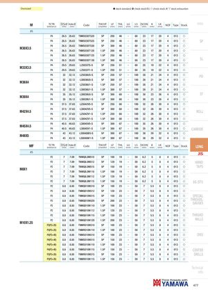 Oversized h stock standard, ) check stock EU, f check stock JP, m stock exhaustion M TCTR Ø Hole Ø(tolerance)(mm)(mm)CodeTHCHT(chamfer)LF(mm)THL(mm) LU(mm) LS DCON K(mm)(mm)(mm)LK(mm)NOFTypeStock Intro JIS P4 26.5 26.63 TNMS030T520 5P 200 46 - 80 23 17 20 4 013 f P4 26.5 26.63 TNMS030T525 5P 250 46 - 80 23 17 20 4 013 f SP P4 26.5 26.63 TNMS030T530 5P 300 46 - 80 23 17 20 4 013 f M30X3.5 P4 26.5 26.63 TNMS030T120 1.5P 200 46 - 80 23 17 20 4 013 f P4 26.5 26.63 TNMS030T125 1.5P 250 46 - 80 23 17 20 4 013 f P4 26.5 26.63 TNMS030T130 1.5P 300 46 - 80 23 17 20 4 013 f SL P4 29.5 29.63 L25033T5-S 5P 250 51 - 80 25 19 22 4 013 f M33X3.5 P4 29.5 29.63 L25033T1-S 1.5P 250 51 - 80 25 19 22 4 013 f P4 32 32.12 L25036U5-S 5P 250 57 - 100 28 21 24 4 013 f PO P4 32 32.12 L30036U5-S 5P 300 57 - 100 28 21 24 4 013 f M36X4 P4 32 32.12 L25036U1-S 1.5P 250 57 - 100 28 21 24 4 013 f P4 32 32.12 L30036U1-S 1.5P 300 57 - 100 28 21 24 4 013 f P4 35 35.12 L30039U5-S 5P 300 60 - 100 30 23 26 4 013 f ST M39X4 P4 35 35.12 L30039U1-S 1.5P 300 60 - 100 30 23 26 4 013 f P4 37.5 37.63 L25042V5-S 5P 250 60 - 100 32 26 30 4 013 f P4 37.5 37.63 L30042V5-S 5P 300 60 - 100 32 26 30 4 013 f M42X4.5 P4 37.5 37.63 L25042V1-S 1.5P 250 60 - 100 32 26 30 4 013 f ROLL P4 37.5 37.63 L30042V1-S 1.5P 300 60 - 100 32 26 30 4 013 f P4 40.5 40.63 L30045V5-S 5P 300 67 - 100 35 26 30 4 013 f M45X4.5 P4 40.5 40.63 L30045V1-S 1.5P 300 67 - 100 35 26 30 4 013 f CARBIDE P4 43 43.12 L30048W5-S 5P 300 67 - 100 38 29 32 4 013 f M48X5 P4 43 43.12 L30048W1-S 1.5P 300 67 - 100 38 29 32 4 013 f MF TCTR Ø Hole Ø(tolerance)(mm)(mm)CodeTHCHT(chamfer)LF(mm)THL(mm) LU(mm) LS DCON K(mm)(mm)(mm)LK(mm)NOFTypeStock LONG JIS JIS P2 7 7.09 TNMQ8.0M510 5P 100 19 - 50 6.2 5 8 4 013 f P2 7 7.09 TNMQ8.0M512 5P 120 19 - 50 6.2 5 8 4 013 f HAND P2 7 7.09 TNMQ8.0M515 5P 150 19 - 50 6.2 5 8 4 013 f TAPS M8X1 P2 7 7.09 TNMQ8.0M110 1.5P 100 19 - 50 6.2 5 8 4 013 f P2 7 7.09 TNMQ8.0M112 1.5P 120 19 - 50 6.2 5 8 4 013 f P2 7 7.09 TNMQ8.0M115 1.5P 150 19 - 50 6.2 5 8 4 013 f EG (STI) P2 8.8 8.85 TNMQ010N510 5P 100 23 - 50 7 5.5 8 4 013 f P2 8.8 8.85 TNMQ010N512 5P 120 23 - 50 7 5.5 8 4 013 f P2 8.8 8.85 TNMQ010N515 5P 150 23 - 50 7 5.5 8 4 013 f SPECIAL P2 8.8 8.85 TNMQ010N520 5P 200 23 - 50 7 5.5 8 4 013 f THREADS,GAUGES P2 8.8 8.85 TNMQ010N110 1.5P 100 23 - 50 7 5.5 8 4 013 f P2 8.8 8.85 TNMQ010N112 1.5P 120 23 - 50 7 5.5 8 4 013 f P2 8.8 8.85 TNMQ010N115 1.5P 150 23 - 50 7 5.5 8 4 013 f THREAD P2 8.8 8.85 TNMQ010N120 1.5P 200 23 - 50 7 5.5 8 4 013 f MILLS M10X1.25 P3(P2+20) 8.8 8.85 TNMR010N510 5P 100 23 - 50 7 5.5 8 4 013 f P3(P2+20) 8.8 8.85 TNMR010N110 1.5P 100 23 - 50 7 5.5 8 4 013 f P4(P2+40) 8.8 8.85 TNMS010N510 5P 100 23 - 50 7 5.5 8 4 013 f DIES P4(P2+40) 8.8 8.85 TNMS010N515 5P 150 23 - 50 7 5.5 8 4 013 f P4(P2+40) 8.8 8.85 TNMS010N110 1.5P 100 23 - 50 7 5.5 8 4 013 f P4(P2+40) 8.8 8.85 TNMS010N115 1.5P 150 23 - 50 7 5.5 8 4 013 f CENTER P3(P2+20) 8.8 8.85 TNMR010N515 5P 150 23 - 50 7 5.5 8 4 013 f DRILLS P3(P2+20) 8.8 8.85 TNMR010N115 1.5P 150 23 - 50 7 5.5 8 4 013 f Technical info 477
