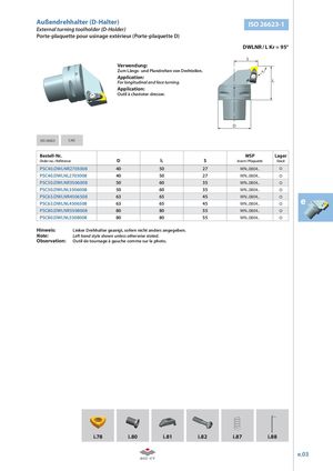 Außendrehhalter (D-Halter) ISO 26623-1 External turning toolholder (D-Holder) Porte-plaquette pour usinage extérieur (Porte-plaquette D) DWLNR / L Kr = 95° S Verwendung: Zum Längs- und Plandrehen von Drehteilen. Kr Application: For longitudinal and face turning. l Application: Outil à charioter-dresser. D ISO 26623 CAD Bestell-Nr. WSP Lager Order no. / Référence D l1 S Insert / Plaquette Stock PSC40.DWLNR2705008 40 50 27 WN..0804.. PSC40.DWLNL2705008 40 50 27 WN..0804.. PSC50.DWLNR3506008 50 60 35 WN..0804.. PSC50.DWLNL3506008 50 60 35 WN..0804.. PSC63.DWLNR4506508 63 65 45 WN..0804..PSC63.DWLNL4506508636545WN..0804.. e PSC80.DWLNR5508008 80 80 55 WN..0804.. PSC80.DWLNL5508008 80 80 55 WN..0804.. Hinweis: Linker Drehhalter gezeigt, sofern nicht anders angegeben. Note: Left hand style shown unless otherwise stated. Observation: Outil de tournage à gauche comme sur la photo. i.78 i.80 i.81 i.82 i.87 i.88 e.03