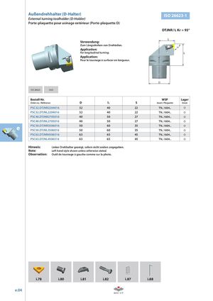 Außendrehhalter (D-Halter) ISO 26623-1 External turning toolholder (D-Holder) Porte-plaquette pour usinage extérieur (Porte-plaquette D) DTJNR / L Kr = 93° S Verwendung: Zum Längsdrehen von Drehteilen. Kr Application: For longitudinal turning. l Application: Pour le tournage á surfacer en longueur. D ISO 26623 CAD Bestell-Nr. WSP Lager Order no. / Référence D l1 S Insert / Plaquette Stock PSC32.DTJNR2204016 32 40 22 TN..1604.. PSC32.DTJNL2204016 32 40 22 TN..1604.. PSC40.DTJNR2705016 40 50 27 TN..1604.. PSC40.DTJNL2705016 40 50 27 TN..1604.. e PSC50.DTJNR3506016PSC50.DTJNL3506016 5050 6060 35 TN..1604..35TN..1604.. PSC63.DTJNR4506516 63 65 45 TN..1604.. PSC63.DTJNL4506516 63 65 45 TN..1604.. Hinweis: Linker Drehhalter gezeigt, sofern nicht anders angegeben. Note: Left hand style shown unless otherwise stated. Observation: Outil de tournage à gauche comme sur la photo. i.78 i.80 i.81 i.82 i.87 i.88 e.04