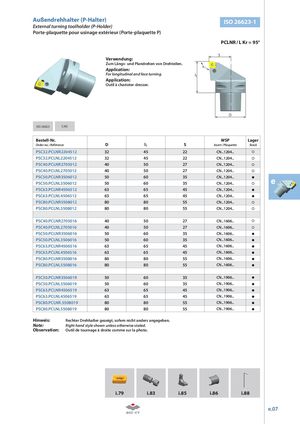 Außendrehhalter (P-Halter) ISO 26623-1 External turning toolholder (P-Holder) Porte-plaquette pour usinage extérieur (Porte-plaquette P) PCLNR / L Kr = 95° S Verwendung: Zum Längs- und Plandrehen von Drehteilen. Kr Application: For longitudinal and face turning. l Application: Outil à charioter-dresser. D ISO 26623 CAD Bestell-Nr. WSP Lager Order no. / Référence D l1 S Insert / Plaquette Stock PSC32.PCLNR2204512 32 45 22 CN..1204.. PSC32.PCLNL2204512 32 45 22 CN..1204.. PSC40.PCLNR2705012 40 50 27 CN..1204.. PSC40.PCLNL2705012 40 50 27 CN..1204.. PSC50.PCLNR3506012 50 60 35 CN..1204..PSC50.PCLNL3506012506035CN..1204..e PSC63.PCLNR4506512 63 65 45 CN..1204.. PSC63.PCLNL4506512 63 65 45 CN..1204.. PSC80.PCLNR5508012 80 80 55 CN..1204.. PSC80.PCLNL5508012 80 80 55 CN..1204.. PSC40.PCLNR2705016 40 50 27 CN..1606.. PSC40.PCLNL2705016 40 50 27 CN..1606.. PSC50.PCLNR3506016 50 60 35 CN..1606.. PSC50.PCLNL3506016 50 60 35 CN..1606.. PSC63.PCLNR4506516 63 65 45 CN..1606.. PSC63.PCLNL4506516 63 65 45 CN..1606.. PSC80.PCLNR5508016 80 80 55 CN..1606.. PSC80.PCLNL5508016 80 80 55 CN..1606.. PSC50.PCLNR3506019 50 60 35 CN..1906.. PSC50.PCLNL3506019 50 60 35 CN..1906.. PSC63.PCLNR4506519 63 65 45 CN..1906.. PSC63.PCLNL4506519 63 65 45 CN..1906.. PSC80.PCLNR.5508019 80 80 55 CN..1906.. PSC80.PCLNL5508019 80 80 55 CN..1906.. Hinweis: Rechter Drehhalter gezeigt, sofern nicht anders angegeben. Note: Right hand style shown unless otherwise stated. Observation: Outil de tournage à droite comme sur la photo. i.79 i.83 i.85 i.86 i.88 e.07