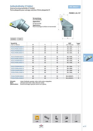 l1 Außendrehhalter (P-Halter) ISO 26623-1 External turning toolholder (P-Holder) Porte-plaquette pour usinage extérieur (Porte-plaquette P) PSKNR / L Kr=75° S Kr Verwendung: Zum Plandrehen Application: For face turning. Application: Pour le tournage á surfacer en transversale. D ISO 26623 CAD Bestell-Nr. WSP Lager Order no. / Référence D l1 S Insert / Plaquette Stock PSC50.PSKNR3506012 50 60 35 SN..1204.. PSC50.PSKNL3506012 50 60 35 SN..1204.. PSC63.PSKNR4506512 63 65 45 SN..1204.. PSC63.PSKNL4506512 63 65 45 SN..1204.. PSC50.PSKNR3506015 50 60 35 SN..1506.. e PSC50.PSKNL3506015 50 60 35 SN..1506.. PSC63.PSKNR4506515 63 65 45 SN..1506.. PSC63.PSKNL4506515 63 65 45 SN..1506.. PSC63.PSKNR4506519 50 65 45 SN..1906.. PSC63.PSKNL4506519 50 65 45 SN..1906.. PSC80.PSKNR5508019 63 80 55 SN..1906.. PSC80.PSKNL5508019 63 80 55 SN..1906.. PSC80.PSKNR5508025 80 80 55 SN..2509/07.. PSC80.PSKNL5508025 80 80 55 SN..2509/07.. Hinweis: Linker Drehhalter gezeigt, sofern nicht anders angegeben. Note: Left hand style shown unless otherwise stated. Observation: Outil de tournage à gauche comme sur la photo. i.81 i.83 i.85 i.86 i.88 e.11