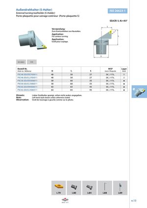 Außendrehhalter (S-Halter) ISO 26623-1 External turning toolholder (S-Holder) Porte-plaquette pour usinage extérieur (Porte-plaquette S) SDJCR / L Kr=93° S Verwendung: Zum Konturdrehen von Bauteilen. Kr Application: For contour turning. l Application: Outil pour copiage. D ISO 26623 CAD Bestell-Nr. WSP Lager Order no. / Référence D l1 S Insert / Plaquette Stock PSC40.SDJCR2705011 40 50 27 DC..11T3.. PSC40.SDJCL2705011 40 50 27 DC..11T3.. PSC50.SDJCR3506011 50 60 35 DC..11T3.. PSC50.SDJCL3506011 50 60 35 DC..11T3.. PSC63.SDJCR4506511 63 65 45 DC..11T3..PSC63.SDJCL4506511636545DC..11T3.. e Hinweis: Linker Drehhalter gezeigt, sofern nicht anders angegeben. Note: Left hand style shown unless otherwise stated. Observation: Outil de tournage à gauche comme sur la photo. i.79 i.80 i.84 i.88 i.89 e.13