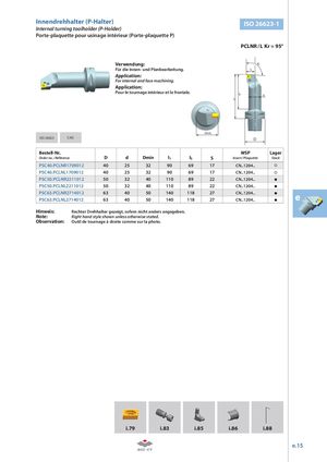 Innendrehhalter (P-Halter) ISO 26623-1 Internal turning toolholder (P-Holder) Porte-plaquette pour usinage intérieur (Porte-plaquette P) PCLNR / L Kr = 95° Verwendung: Kr Für die Innen- und Planbearbeitung. S Application: For internal and face machining. Application: Pour le tournage intérieur et le frontale. l d l Dmin ISO 26623 CAD D Bestell-Nr. WSP Lager Order no. / Référence D d Dmin l1 l3 S Insert / Plaquette Stock PSC40.PCLNR1709012 40 25 32 90 69 17 CN..1204.. PSC40.PCLNL1709012 40 25 32 90 69 17 CN..1204.. PSC50.PCLNR2211012 50 32 40 110 89 22 CN..1204.. PSC50.PCLNL2211012 50 32 40 110 89 22 CN..1204.. PSC63.PCLNR2714012 63 40 50 140 118 27 CN..1204..PSC63.PCLNL271401263405014011827CN..1204..e Hinweis: Rechter Drehhalter gezeigt, sofern nicht anders angegeben. Note: Right hand style shown unless otherwise stated. Observation: Outil de tournage à droite comme sur la photo. i.79 i.83 i.85 i.86 i.88 e.15