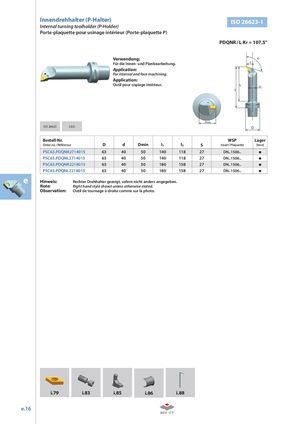 Innendrehhalter (P-Halter) ISO 26623-1 Internal turning toolholder (P-Holder) Porte-plaquette pour usinage intérieur (Porte-plaquette P) PDQNR / L Kr = 107,5° Verwendung: Kr Für die Innen- und Planbearbeitung. S Application: For internal and face machining. Application: Outil pour copiage intérieur. l d l Dmin ISO 26623 CAD D Bestell-Nr. WSP Lager Order no. / Référence D d Dmin l1 l3 S Insert / Plaquette Stock PSC63.PDQNR2714015 63 40 50 140 118 27 DN..1506.. PSC63.PDQNL2714015 63 40 50 140 118 27 DN..1506.. PSC63.PDQNR2218015 63 40 50 180 158 27 DN..1506.. PSC63.PDQNL2218015 63 40 50 180 158 27 DN..1506.. e Hinweis: Rechter Drehhalter gezeigt, sofern nicht anders angegeben. Note: Right hand style shown unless otherwise stated. Observation: Outil de tournage à droite comme sur la photo. i.79 i.83 i.85 i.86 i.88 e.16