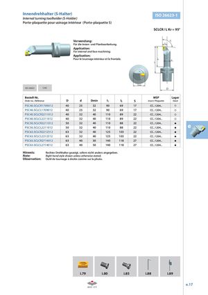 Innendrehhalter (S-Halter) ISO 26623-1 Internal turning toolholder (S-Holder) Porte-plaquette pour usinage intérieur (Porte-plaquette S) SCLCR / L Kr = 95° Verwendung: Kr Für die Innen- und Planbearbeitung. S Application: For internal and face machining. Application: Pour le tournage intérieur et le frontale. l d l Dmin ISO 26623 CAD D Bestell-Nr. WSP Lager Order no. / Référence D d Dmin l1 l3 S Insert / Plaquette Stock PSC40.SCLCR1709012 40 25 32 90 69 17 CC..1204.. PSC40.SCLCL1709012 40 25 32 90 69 17 CC..1204.. PSC40.SCLCR2211012 40 32 40 110 89 22 CC..1204.. PSC40.SCLCL2211012 40 32 40 110 89 22 CC..1204.. PSC50.SCLCR2211012 50 32 40 110 88 22 CC..1204..PSC50.SCLCL22110125032401108822CC..1204..e PSC63.SCLCR2212512 63 32 40 125 103 22 CC..1204.. PSC63.SCLCL2212512 63 32 40 125 103 22 CC..1204.. PSC63.SCLCR2714012 63 40 50 140 118 27 CC..1204.. PSC63.SCLCL2714012 63 40 50 140 118 27 CC..1204.. Hinweis: Rechter Drehhalter gezeigt, sofern nicht anders angegeben. Note: Right hand style shown unless otherwise stated. Observation: Outil de tournage à droite comme sur la photo. i.79 i.80 i.85 i.88 i.89 e.17
