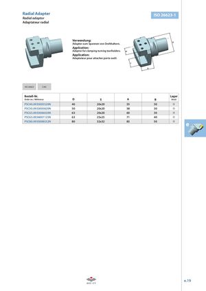 B s D Radial Adapter ISO 26623-1 Radial adaptor Adaptateur radial Verwendung: Adapter zum Spannen von Drehhaltern. Application: Adaptor for clamping turning toolholders. Application: Adaptateur pour attacher porte outil. A ISO 26623 CAD Bestell-Nr. Lager Order no. / Référence D S A B Stock PSC40.0933005520N 40 20x20 55 30 PSC50.0933005820N 50 20x20 58 30 PSC63.0933006020N 63 20x20 60 30 PSC63.0934007125N 63 25x25 71 40 PSC80.0935008532N 80 32x32 85 50 e e.19