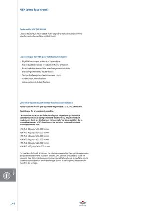 HSK (cône face creux) Porte-outils HSK DIN 69893 Le cône face creux (HSK) s‘était établi depuis la standardisation comme interface entre la machine-outil et l‘outil. Les avantages de l’HSK pour l’utilisateur incluent: • Rigidité hautement statique et dynamique. • Reproductibilité axiale et radiale de haute précision. • Exactitude invraisemblable aux changements répétés • Bon comportement à haute vitesse • Temps de changement extrêmement courts • Codi cation, identi cation • Alimentation de la lubri cation Conseils d‘équilibrage et limites des vitesses de rotation Porte-outils HSK sont pré-équilibré de principe à G 6,3 15.000 tr./mn. Équilibrage n si besoin est possible. La vitesse de rotation est le facteur le plus important qui in uence considérablement le comportement des broches, attachements et roulements dont les limites sont connues et c‘est pourquoi, lors de la normalisation des HSK, des vitesses de rotation maximales ont été retenues comme suit: HSK-A/C 32 jusqu‘à 30.000 tr./mn HSK-A/C 40 jusqu‘à 30.000 tr./mn HSK-A/C 50 jusqu‘à 30.000 tr./mn HSK-A/C 63 jusqu‘à 25.000 tr./mn HSK-A/C 80 jusqu‘à 20.000 tr./mn HSK-A/C 100 jusqu‘à 16.000 tr./mn En fonction de l‘outil, à vitesses de rotation maximales, il est parfois nécessaire d‘équilibrer l‘ensemble, mandrin et outil. Des valeurs précises à ce sujet ne peuvent être déterminées que si la machine et la broche de la machine on été prises en considération ainsi que le type d‘outil et sa longueur dépassant le mandrin de serrage. i j.44