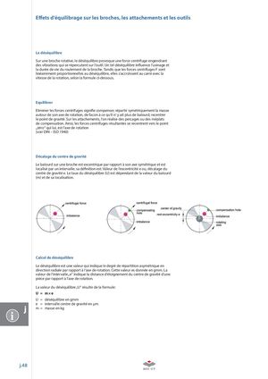 E ets d‘équilibrage sur les broches, les attachements et les outils Le déséquilibre Sur une broche rotative, le déséquilibre provoque une force centrifuge engendrant des vibrations qui se répercutent sur l‘outil. Un tel déséquilibre in uence l‘usinage et la durée de vie du roulement de la broche. Tandis que les forces centrifuges F sont linéairement proportionnelles au déséquilibre, elles s‘accroîssent au carré avec la vitesse de la rotation, selon la formule ci-dessous. Equilibrer Eliminer les forces centrifuges signi e compenser, répartir symétriquement la masse autour de son axe de rotation, de facon à ce qu‘il n‘ y ait plus de balourd, recentrer le point de gravité. Sur les attachements, l‘on réalise des percages ou des méplats de compensation. Ainsi, les forces centrifuges résultantes se recentrent vers le point „zéro“ qui lui, est l‘axe de rotation (voir DIN – ISO 1940) Décalage du centre de gravité Le balourd sur une broche est excentrique par rapport à son axe symétrique et est localisé par un intervalle; sa dé nition est: Valeur de l‘excentricité e ou, décalage du centre de gravité e. Le taux du déséquilibre (U) est dépendant de la valeur du balourd (m) et de sa localisation. Calcul de déséquilibre Le déséquilibre est une valeur qui indique le degré de répartition asymétrique en direction radiale par rapport à l‘axe de rotation. Cette valeur es donnée en gmm. La valeur de l‘intervalle „e“ indique la distance d‘éloignement du centre de gravité d‘une pièce par rapport à l‘axe de rotation. La valeur du déséquilibre „U“ résulte de la formule: U = m×e U = déséquilibre en gmm e = intervalle centre de gravité en μm m = masse en kg i j.48