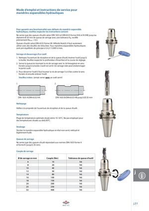 Mode d‘emploi et instructions de service pour mandrins expansibles hydrauliques Pour garantir une fonctionnalité sans défauts du mandrin expansible hydraulique, veuillez respecter les instructions suivant: Ne serrez que des queues d‘outils selon DIN 1835 et DIN 6535 forme (HA) et B (HB) jusqu‘au diamètre Ø 20 mm de queue de serrage avec une tolérance h6, recti é précisement Ramin = 0,3. Queues d‘outils selon DIN 6535 forme HE (Whistle Notch) il faut seulement utilser avec des douilles de réduction. Tous mandrins expansibles hydrauliques sont pré-équilibrés de principe à G 6,3 15.000 tr/min. Serrage et desserrage d‘un outil 1. Nettoyez l‘ouverture de réception et de la queue d‘outil. Insérez l‘outil jusqu‘à la butée. Veuillez respecter la profondeur d‘insertion et la course de réglage. 2. Serrez la queue en tournant la vis de serrage avec le clé hexagonal en sens horaire jusqu‘à la butée. L‘outil est serré. Un serrage vide peut endommager le porte-outil. 3. Pour desserrer l‘outil il faut tourner la vis de serrage 5 à 6 fois contre le sens horaire et ensuite enlever l‘outil. Veuillez notee : Jamais serrer sans un outil serré ! 1 2 DIN 1835 A/DIN 6535 HA DIN 1835 B/DIN 6535 HB jusqu‘à Ø 20 mm Nettoyage Veillez à la propreté de l‘ouverture de réception et de la queue d‘outil. Température Plage de température optimale située entre 10–50°C. Ne pas employer pour des températures situées au delà 80°C. Stockage Stocker le mandrin expansible hydraulique en état non serré, nettoyé et légèrement huilé. Queues de serrage Ne serrez que des queues d‘outil répondant aux normes DIN 1835 forme A et forme B (jusqu‘à 20 mm). Couple de serrage Ø de serrage en mm Couple (Nm) Tolérance de queue d‘outil 6 10 h6 8 20 h6 10 40 h6 12 50 h6 j 14 80 h616100h6 i 18 150 h6 20 200 h6 25 250 h6 32 400 h6 j.51