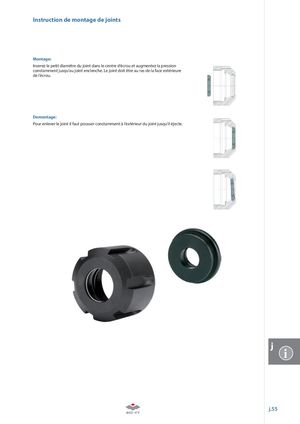 Instruction de montage de joints Montage: Inserez le petit diamètre du joint dans le centre d‘écrou et augmentez la pression constamment jusqu‘au joint enclenche. Le joint doit être au ras de la face extérieure de l‘écrou. Demontage: Pour enlever le joint il faut pousser constamment à l‘extérieur du joint jusqu‘il éjecte. j i j.55