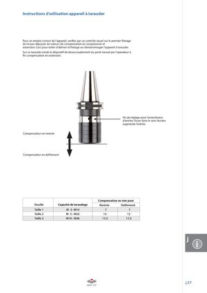Instructions d‘utilisation appareil à tarauder Pour un emploi correct de l‘appareil, veri er par un contrôle visuel sur le premier letage de ne pas dépasser les valeurs de compensation en compression et extension. Ceci pour éviter d‘abîmer le letage ou d‘endommager l‘appareil à tarauder. Sur ce tarauder existe le dispositif de desaccouplement du porte taraud par l‘operateur à n compensation en extension. Vis de réglage pour l‘amortisseur d‘entrée. Visser dans le sens horaire augmente l‘entrée. Compensation en rentrée Compensation en de lement Compensation en mm pour Douille Capacité de taraudage Rentrée De lement Taille 1 M 3– M14 7 7 Taille 2 M 5 – M22 12 12 Taille 3 M14 – M36 17,5 17,5 j i j.57