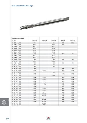 Pour taraud-taille de la tige Diamètre de la queue Ø× DIN 352 DIN 5157 DIN 371 DIN 374 DIN 376 Ø 2,5 × 2,1 M1 M1 M3 M3,5 Ø 2,5 × 2,1 M1,1 M1,1 M3,5 Ø 2,5 × 2,1 M1,2 M1,2 Ø 2,5 × 2,1 M1,4 M1,4 Ø 2,5 × 2,1 M1,6 M1,6 Ø 2,5 × 2,1 M1,8 M1,8 Ø 2,8 × 2,1 M2 M2 M4 M4 Ø 2,8 × 2,1 M2,2 M2,2 Ø 2,8 × 2,1 M2,5 M2,5 Ø 3,5 × 2,7 M3 M3 M5 M5 Ø 4 × 3 M3,5 M3,5 Ø 4,5 × 3,4 M4 M4 M6 M6 Ø 6 × 4,9 M5 M5 Ø 6 × 4,9 M6 M6 Ø 6 × 4,9 M8 M8 M8 Ø 7 × 5,5 M10 G 1/8” M10 M10 Ø 8 × 6,2 M8 Ø 9 × 7 M12 M12 M12 Ø 10 × 8 M10 Ø 11 × 9 M14 G 1/4” M14 M14 Ø 12 × 9 M16 G 3/8” M16 M16 Ø 14 × 11 M18 M18 M18 Ø 16 × 12 M20 G 1/2” M20 M20 Ø 18 × 14,5 M22 G 5/8” M22 M22 Ø 18 × 14,5 M24 M24 M24 Ø 20 × 16 M27 G 3/4” M27 M27 Ø 22 × 18 M30 G 7/8” M30 M30 Ø 25 × 20 M33 G1 M33 M33 Ø 28 × 22 M36 G 11/8” M36 M36 Ø 32 × 34 M39 G 11/4” M39 M39 Ø 32 × 24 M42 M42 M42 Ø 36 × 29 M45 G 13/8” M45 M45 i Ø 36 × 29 Ø 36× 29 M48 G 11/2”G 13/4” M48 M48 Ø 36 × 29 G 2” j.58