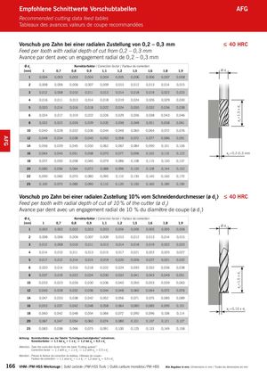 ap=1,5 x d1ap=1,5 x d1 AFG Empfohlene Schnittwerte Vorschubtabellen AFG Recommended cutting data feed tables Tableaux des avances valeurs de coupe recommandées Vorschub pro Zahn bei einer radialen Zustellung von 0,2 – 0,3 mm ≤ 40 HRC Feed per tooth with radial depth of cut from 0,2 – 0,3 mm Avance par dent avec un engagement radial de 0,2 – 0,3 mm Ø d1 Korrekturfaktor / Correction factor / Facteur de correction [mm] 1 0,7 0,8 0,9 1,1 1,2 1,5 1,6 1,8 1,9 Ø d1 1 0,004 0,003 0,003 0,004 0,004 0,005 0,006 0,006 0,007 0,008 2 0,008 0,006 0,006 0,007 0,009 0,010 0,012 0,013 0,014 0,015 3 0,012 0,008 0,010 0,011 0,013 0,014 0,018 0,019 0,022 0,023 4 0,016 0,011 0,013 0,014 0,018 0,019 0,024 0,026 0,029 0,030 5 0,020 0,014 0,016 0,018 0,022 0,024 0,030 0,032 0,036 0,038 6 0,024 0,017 0,019 0,022 0,026 0,029 0,036 0,038 0,043 0,046 8 0,032 0,022 0,026 0,029 0,035 0,038 0,048 0,051 0,058 0,061 10 0,040 0,028 0,032 0,036 0,044 0,048 0,060 0,064 0,072 0,076 12 0,048 0,034 0,038 0,043 0,053 0,058 0,072 0,077 0,086 0,091 14 0,056 0,039 0,045 0,050 0,062 0,067 0,084 0,090 0,101 0,106 16 0,064 0,045 0,051 0,058 0,070 0,077 0,096 0,102 0,115 0,122 ae=0,2-0,3 mm 18 0,072 0,050 0,058 0,065 0,079 0,086 0,108 0,115 0,130 0,137 20 0,080 0,056 0,064 0,072 0,088 0,096 0,120 0,128 0,144 0,152 22 0,090 0,060 0,070 0,080 0,095 0,110 0,130 0,140 0,160 0,170 25 0,100 0,070 0,080 0,090 0,110 0,120 0,150 0,160 0,180 0,190 Vorschub pro Zahn bei einer radialen Zustellung 10 % vom Schneidendurchmesser (ø d1) ≤ 40 HRC Feed per tooth with radial depth of cut of 10 % of the cutter (ø d1) Avance par dent avec un engagement radial de 10 % du diamètre de coupe (ø d1) Ø d1 Korrekturfaktor / Correction factor / Facteur de correction [mm] 1 0,7 0,8 0,9 1,1 1,2 1,5 1,6 1,8 1,9 Ø d1 1 0,003 0,002 0,002 0,003 0,003 0,004 0,005 0,005 0,005 0,006 2 0,008 0,006 0,006 0,007 0,009 0,010 0,012 0,013 0,014 0,015 3 0,012 0,008 0,010 0,011 0,013 0,014 0,018 0,019 0,022 0,023 4 0,014 0,010 0,011 0,013 0,015 0,017 0,021 0,022 0,025 0,027 5 0,017 0,012 0,014 0,015 0,019 0,020 0,026 0,027 0,031 0,032 6 0,020 0,014 0,016 0,018 0,022 0,024 0,030 0,032 0,036 0,038 8 0,027 0,019 0,022 0,024 0,030 0,032 0,041 0,043 0,049 0,051 10 0,033 0,023 0,026 0,030 0,036 0,040 0,050 0,053 0,059 0,063 12 0,040 0,028 0,032 0,036 0,044 0,048 0,060 0,064 0,072 0,076 14 0,047 0,033 0,038 0,042 0,052 0,056 0,071 0,075 0,085 0,089 16 0,053 0,037 0,042 0,048 0,058 0,064 0,080 0,085 0,095 0,101 ae=0,10 x d1 18 0,060 0,042 0,048 0,054 0,066 0,072 0,090 0,096 0,108 0,114 20 0,067 0,047 0,054 0,060 0,074 0,080 0,101 0,107 0,121 0,127 25 0,083 0,058 0,066 0,075 0,091 0,100 0,125 0,133 0,149 0,158 Achtung: Korrekturfaktor aus der Tabelle “Schnittgeschwindigkeiten” entnehmen. Korrekturfaktor -> 1,1 bei ap = 1 x d1 -> 1,2 bei ap = 0,5 x d1 Attention: Take the correction factor from the table “Cutting speeds”. Correction factor -> 1,1 with ap = 1 x d1 -> 1,2 with ap = 0,5 x d1 Attention : Prenez le facteur de correction du tableau «Vitesses de coupe». Facteur de correction -> 1,1 pour ap = 1 x d1 -> 1,2 pour ap = 0,5 x d1 166 VHM- / PM-HSS Werkzeuge | Solid carbide- / PM-HSS Tools | Outils carbure monobloc / PM-HSS Alle Angaben in mm / Dimensions in mm / Toutes les dimensions en mm