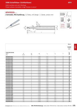 d d3 15°-20° dA TiA70 AFH l VHM-Schaftfräser (Schlitzfräsen) AFH Solid carbide end-mill (Slotting) Fraise carbure monobloc à tige (fraises à rainer) AFH50526-… 2 Schneiden, Mini-Ausführung / 2 flutes, mini design / 2 dents, version mini HA 206 – 223 30° 2 Feinstkorn Ultra micro granulation Grain ultra fin l1 l2 PG 24 beschichtet coated revêtu Schaft DIN 6535HA Shank d dA d3 l1 l2 l Tige -0,012 h6 AFH50526-001A 0,1 4 0,085 0,15 0,3 45 AFH50526-001B 0,1 4 0,085 0,15 0,5 45 AFH50526-002A 0,2 4 0,180 0,30 0,5 45 AFH50526-002B 0,2 4 0,180 0,30 1,0 45 AFH50526-002C 0,2 4 0,180 0,30 1,5 45 AFH50526-003A 0,3 4 0,270 0,45 1,0 45 AFH50526-003B 0,3 4 0,270 0,45 1,5 45 AFH50526-003C 0,3 4 0,270 0,45 2,0 45 AFH50526-003D 0,3 4 0,270 0,45 3,0 45 AFH50526-003E 0,3 4 0,270 0,45 4,0 45 AFH50526-004A 0,4 4 0,370 0,60 1,0 45 AFH50526-004B 0,4 4 0,370 0,60 2,0 45 AFH50526-004C 0,4 4 0,370 0,60 3,0 45 AFH50526-004D 0,4 4 0,370 0,60 4,0 45 AFH50526-004E 0,4 4 0,370 0,60 5,0 45 AFH50526-005A 0,5 4 0,450 0,70 2,0 45 AFH50526-005B 0,5 4 0,450 0,70 2,5 45 AFH50526-005C 0,5 4 0,450 0,70 4,0 45 AFH50526-005D 0,5 4 0,450 0,70 6,0 45 AFH50526-005E 0,5 4 0,450 0,70 8,0 45 AFH50526-006A 0,6 4 0,550 0,90 2,0 45 AFH50526-006B 0,6 4 0,550 0,90 3,0 45 AFH50526-006C 0,6 4 0,550 0,90 4,0 45 AFH50526-006D 0,6 4 0,550 0,90 6,0 45 AFH50526-006E 0,6 4 0,550 0,90 8,0 45 AFH50526-006F 0,6 4 0,550 0,90 10,0 45 AFH50526-008A 0,8 4 0,750 1,20 2,0 45 AFH50526-008B 0,8 4 0,750 1,20 4,0 45 AFH50526-008C 0,8 4 0,750 1,20 6,0 45 AFH50526-008D 0,8 4 0,750 1,20 8,0 45 AFH50526-008E 0,8 4 0,750 1,20 10,0 45 AFH50526-008F 0,8 4 0,750 1,20 12,0 45 AFH50526-010A 1,0 4 0,950 1,50 4,0 45 Alle Angaben in mm / Dimensions in mm / Toutes les dimensions en mm VHM- / PM-HSS Werkzeuge | Solid carbide- / PM-HSS Tools | Outils carbure monobloc / PM-HSS 175