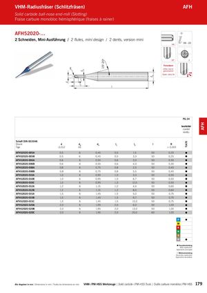 d d3 15°-20° dA TiA70 AFH l VHM-Radiusfräser (Schlitzfräsen) AFH Solid carbide ball-nose end-mill (Slotting) Fraise carbure monobloc hémisphérique (fraises à rainer) AFH52020-… 2 Schneiden, Mini-Ausführung / 2 flutes, mini design / 2 dents, version mini HA 206 – 223 30° 2 Feinstkorn R Ultra micro granulation Grain ultra fin l1 l2 PG 24 beschichtet coated revêtu Schaft DIN 6535HA Shank d dA d3 l1 l2 l R Tige -0,012 h6 ± 0,005 AFH52020-005A 0,5 6 0,45 0,5 1,5 50 0,25 AFH52020-005B 0,5 6 0,45 0,5 3,3 50 0,25 AFH52020-006A 0,6 6 0,55 0,6 2,0 50 0,30 AFH52020-006B 0,6 6 0,55 0,6 4,0 50 0,30 AFH52020-008A 0,8 6 0,75 0,8 2,5 50 0,40 AFH52020-008B 0,8 6 0,75 0,8 5,5 50 0,40 AFH52020-010A 1,0 6 0,95 1,0 3,3 50 0,50 AFH52020-010B 1,0 6 0,95 1,0 6,7 50 0,50 AFH52020-010C 1,0 6 0,95 1,0 12,0 50 0,50 AFH52020-012A 1,2 6 1,15 1,2 4,4 50 0,60 AFH52020-012B 1,2 6 1,15 1,2 8,0 50 0,60 AFH52020-015A 1,5 6 1,45 1,5 5,0 50 0,75 AFH52020-015B 1,5 6 1,45 1,5 9,7 50 0,75 AFH52020-015C 1,5 6 1,45 1,5 15,0 50 0,75 AFH52020-020A 2,0 6 1,95 2,0 6,0 50 1,00 AFH52020-020B 2,0 6 1,95 2,0 13,0 50 1,00 AFH52020-020C 2,0 6 1,95 2,0 20,0 60 1,00 Hauptanwendung Main application Application principale Nebenanwendung Secondary application Application secondaire Alle Angaben in mm / Dimensions in mm / Toutes les dimensions en mm VHM- / PM-HSS Werkzeuge | Solid carbide- / PM-HSS Tools | Outils carbure monobloc / PM-HSS 179
