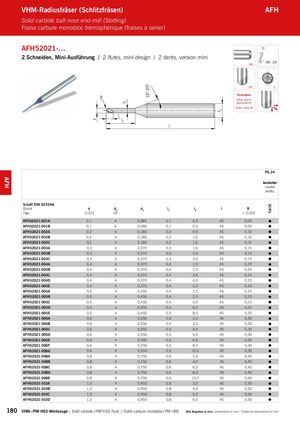 d d3 15°-20° dA TiA70 l AFH VHM-Radiusfräser (Schlitzfräsen) AFH Solid carbide ball-nose end-mill (Slotting) Fraise carbure monobloc hémisphérique (fraises à rainer) AFH52021-… 2 Schneiden, Mini-Ausführung / 2 flutes, mini design / 2 dents, version mini HA 206 – 223 30° 2 R FeinstkornUltra micro granulation Grain ultra fin l1 l2 PG 24 beschichtet coated revêtu Schaft DIN 6535HA Shank d dA d3 l1 l2 l R Tige -0,012 h6 ± 0,005 AFH52021-001A 0,1 4 0,085 0,1 0,3 45 0,05 AFH52021-001B 0,1 4 0,085 0,1 0,5 45 0,05 AFH52021-002A 0,2 4 0,180 0,2 0,5 45 0,10 AFH52021-002B 0,2 4 0,180 0,2 1,0 45 0,10 AFH52021-002C 0,2 4 0,180 0,2 1,5 45 0,10 AFH52021-003A 0,3 4 0,270 0,3 1,0 45 0,15 AFH52021-003B 0,3 4 0,270 0,3 2,0 45 0,15 AFH52021-003C 0,3 4 0,270 0,3 3,0 45 0,15 AFH52021-004A 0,4 4 0,370 0,4 1,0 45 0,20 AFH52021-004B 0,4 4 0,370 0,4 2,0 45 0,20 AFH52021-004C 0,4 4 0,370 0,4 3,0 45 0,20 AFH52021-004D 0,4 4 0,370 0,4 4,0 45 0,20 AFH52021-004E 0,4 4 0,370 0,4 5,0 45 0,20 AFH52021-005A 0,5 4 0,450 0,4 2,0 45 0,25 AFH52021-005B 0,5 4 0,450 0,4 2,5 45 0,25 AFH52021-005C 0,5 4 0,450 0,4 4,0 45 0,25 AFH52021-005D 0,5 4 0,450 0,4 6,0 45 0,25 AFH52021-005E 0,5 4 0,450 0,4 8,0 45 0,25 AFH52021-006A 0,6 4 0,550 0,5 2,0 45 0,30 AFH52021-006B 0,6 4 0,550 0,5 3,0 45 0,30 AFH52021-006C 0,6 4 0,550 0,5 4,0 45 0,30 AFH52021-006D 0,6 4 0,550 0,5 5,0 45 0,30 AFH52021-006E 0,6 4 0,550 0,5 6,0 45 0,30 AFH52021-006F 0,6 4 0,550 0,5 8,0 45 0,30 AFH52021-006G 0,6 4 0,550 0,5 10,0 45 0,30 AFH52021-008A 0,8 4 0,750 0,6 2,0 45 0,40 AFH52021-008B 0,8 4 0,750 0,6 4,0 45 0,40 AFH52021-008C 0,8 4 0,750 0,6 6,0 45 0,40 AFH52021-008D 0,8 4 0,750 0,6 8,0 45 0,40 AFH52021-008E 0,8 4 0,750 0,6 10,0 45 0,40 AFH52021-010A 1,0 4 0,950 0,8 3,0 45 0,50 AFH52021-010B 1,0 4 0,950 0,8 4,0 45 0,50 AFH52021-010C 1,0 4 0,950 0,8 5,0 45 0,50 AFH52021-010D 1,0 4 0,950 0,8 6,0 45 0,50 180 VHM- / PM-HSS Werkzeuge | Solid carbide- / PM-HSS Tools | Outils carbure monobloc / PM-HSS Alle Angaben in mm / Dimensions in mm / Toutes les dimensions en mm