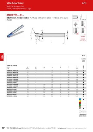 d d3 dA TiA70 l AFH VHM-Schaftfräser AFH Solid carbide end-mill Fraise carbure monobloc à tige AFH50725-…R… 2 Schneiden, mit Eckenradius / 2 flutes, with corner radius / 2 dents, avec rayon d‘angle HA 206 – 223 2 R R 30° Feinstkorn l1 l2 Ultra microgranulationGrain ultra fin PG 24 beschichtet coated revêtu Schaft DIN 6535HA Shank d dA d3 l1 l2 l R Tige -0,012 h6 -0,01 AFH50725-005R0,05 0,5 4 - 1,0 - 40 0,05 AFH50725-006R0,05 0,6 4 - 1,2 - 40 0,05 AFH50725-007R0,05 0,7 4 - 1,4 - 40 0,05 AFH50725-008R0,05 0,8 4 - 1,6 - 40 0,05 AFH50725-009R0,05 0,9 4 - 2,0 - 40 0,05 AFH50725-010AR0,1 1,0 4 - 1,5 - 40 0,10 AFH50725-010BR0,1 1,0 6 - 1,5 - 40 0,10 AFH50725-015R0,1 1,5 6 - 2,2 - 40 0,10 AFH50725-020AR0,1 2,0 4 1,95 3,0 6 40 0,10 AFH50725-020BR0,1 2,0 6 1,95 3,0 6 40 0,10 AFH50725-025R0,1 2,5 6 2,40 4,0 6 40 0,10 AFH50725-030R0,1 3,0 6 2,85 4,0 7 45 0,10 AFH50725-035R0,1 3,5 6 3,35 5,0 9 45 0,10 AFH50725-040R0,1 4,0 6 3,85 5,0 9 45 0,10 AFH50725-045R0,1 4,5 6 4,35 6,0 10 45 0,10 AFH50725-050R0,2 5,0 6 4,85 6,0 11 50 0,20 Hauptanwendung Main application Application principale Nebenanwendung Secondary application Application secondaire 184 VHM- / PM-HSS Werkzeuge | Solid carbide- / PM-HSS Tools | Outils carbure monobloc / PM-HSS Alle Angaben in mm / Dimensions in mm / Toutes les dimensions en mm