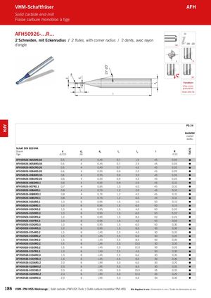 d d3 15°-20° dA TiA70 l AFH VHM-Schaftfräser AFH Solid carbide end-mill Fraise carbure monobloc à tige AFH50926-…R… 2 Schneiden, mit Eckenradius / 2 flutes, with corner radius / 2 dents, avec rayon d‘angle HA 206 – 223 2 R R 30° Feinstkorn l1l2 Ultra microgranulationGrain ultra fin PG 24 beschichtet coated revêtu Schaft DIN 6535HA Shank d dA d3 l1 l2 l R Tige -0,012 h6 -0,01 AFH50926-005AR0,05 0,5 4 0,45 0,7 1,5 45 0,05 AFH50926-005BR0,05 0,5 4 0,45 0,7 2,5 45 0,05 AFH50926-005CR0,05 0,5 4 0,45 0,7 4,0 45 0,05 AFH50926-006AR0,05 0,6 4 0,55 0,9 2,0 45 0,05 AFH50926-006BR0,05 0,6 4 0,55 0,9 3,0 45 0,05 AFH50926-006CR0,05 0,6 4 0,55 0,9 4,0 45 0,05 AFH50926-006DR0,1 0,6 4 0,55 0,9 2,0 45 0,10 AFH50926-007R0,1 0,7 4 0,65 1,0 4,0 45 0,10 AFH50926-008AR0,1 0,8 4 0,75 1,2 2,0 45 0,10 AFH50926-008BR0,1 0,8 4 0,75 1,2 4,0 45 0,10 AFH50926-008CR0,1 0,8 4 0,75 1,2 6,0 45 0,10 AFH50926-010AR0,1 1,0 6 0,95 1,5 4,0 50 0,10 AFH50926-010BR0,1 1,0 6 0,95 1,5 6,0 50 0,10 AFH50926-010CR0,2 1,0 6 0,95 1,5 4,0 50 0,20 AFH50926-010DR0,2 1,0 6 0,95 1,5 6,0 50 0,20 AFH50926-010ER0,2 1,0 6 0,95 1,5 8,0 50 0,20 AFH50926-010FR0,3 1,0 6 0,95 1,5 4,0 50 0,30 AFH50926-010GR0,3 1,0 6 0,95 1,5 6,0 50 0,30 AFH50926-010HR0,3 1,0 6 0,95 1,5 8,0 50 0,30 AFH50926-015AR0,2 1,5 6 1,45 2,5 4,0 50 0,20 AFH50926-015BR0,2 1,5 6 1,45 2,5 6,0 50 0,20 AFH50926-015CR0,2 1,5 6 1,45 2,5 8,0 50 0,20 AFH50926-015DR0,2 1,5 6 1,45 2,5 10,0 50 0,20 AFH50926-015ER0,2 1,5 6 1,45 2,5 12,0 50 0,20 AFH50926-015FR0,3 1,5 6 1,45 2,5 4,0 50 0,30 AFH50926-015GR0,3 1,5 6 1,45 2,5 6,0 50 0,30 AFH50926-015HR0,3 1,5 6 1,45 2,5 8,0 50 0,30 AFH50926-020AR0,2 2,0 6 1,95 3,0 6,0 50 0,20 AFH50926-020BR0,2 2,0 6 1,95 3,0 8,0 50 0,20 AFH50926-020CR0,2 2,0 6 1,95 3,0 10,0 55 0,20 AFH50926-020DR0,2 2,0 6 1,95 3,0 12,0 55 0,20 AFH50926-020ER0,3 2,0 6 1,95 3,0 6,0 50 0,30 186 VHM- / PM-HSS Werkzeuge | Solid carbide- / PM-HSS Tools | Outils carbure monobloc / PM-HSS Alle Angaben in mm / Dimensions in mm / Toutes les dimensions en mm