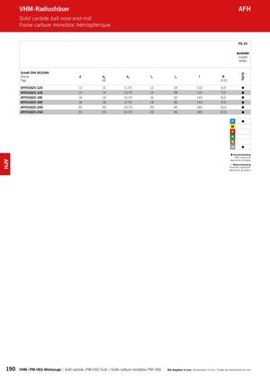TiA70 AFH VHM-Radiusfräser AFH Solid carbide ball-nose end-mill Fraise carbure monobloc hémisphérique PG 24 beschichtet coated revêtu Schaft DIN 6535HA Shank d dA d3 l1 l2 l R Tige h6 -0,01 AFH51625-120 12 12 11,70 12 24 110 6,0 AFH51625-140 14 14 13,70 14 28 110 7,0 AFH51625-160 16 16 15,70 16 32 140 8,0 AFH51625-180 18 18 17,70 18 36 140 9,0 AFH51625-200 20 20 19,70 20 40 160 10,0 AFH51625-250 25 25 24,70 25 50 180 12,5 Hauptanwendung Main application Application principale Nebenanwendung Secondary application Application secondaire 190 VHM- / PM-HSS Werkzeuge | Solid carbide- / PM-HSS Tools | Outils carbure monobloc / PM-HSS Alle Angaben in mm / Dimensions in mm / Toutes les dimensions en mm
