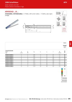 d d3 dA TiA70 AFH l VHM-Schaftfräser AFH Solid carbide end-mill Fraise carbure monobloc à tige AFH50142-…R… 4 Schneiden, mit Eckenradius / 4 flutes, with corner radius / 4 dents, avec rayon d‘angle HA 206 – 223 4 R R 30° Feinstkorn l1 Ultra micro l2 granulation Grain ultra fin PG 24 beschichtet coated revêtu Schaft DIN 6535HA Shank d dA d3 l1 l2 l R Tige -0,015 h6 ±0,015 AFH50142-060R0,5 6 6 5,85 9 20 90 0,5 AFH50142-060R1,0 6 6 5,85 9 20 90 1,0 AFH50142-080R0,5 8 8 7,70 12 25 100 0,5 AFH50142-080R1,0 8 8 7,70 12 25 100 1,0 AFH50142-100R0,5 10 10 9,70 15 32 100 0,5 AFH50142-100R1,0 10 10 9,70 15 32 100 1,0 AFH50142-100R2,0 10 10 9,70 15 32 100 2,0 AFH50142-120R0,5 12 12 11,70 18 38 110 0,5 AFH50142-120R1,0 12 12 11,70 18 38 110 1,0 AFH50142-120R2,0 12 12 11,70 18 38 110 2,0 Hauptanwendung Main application Application principale Nebenanwendung Secondary application Application secondaire Alle Angaben in mm / Dimensions in mm / Toutes les dimensions en mm VHM- / PM-HSS Werkzeuge | Solid carbide- / PM-HSS Tools | Outils carbure monobloc / PM-HSS 195