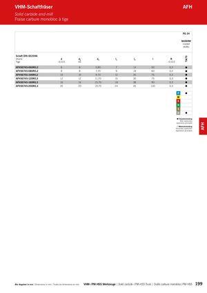 TiA70 AFH VHM-Schaftfräser AFH Solid carbide end-mill Fraise carbure monobloc à tige PG 24 beschichtet coated revêtu Schaft DIN 6535HA Shank d dA d3 l1 l2 l R Tige -0,015 h6 -0,015 AFH50745-060R0,2 6 6 5,85 7 14 50 0,2 AFH50745-080R0,2 8 8 7,70 9 18 60 0,2 AFH50745-100R0,2 10 10 9,70 12 25 75 0,2 AFH50745-120R0,3 12 12 11,70 15 30 75 0,3 AFH50745-160R0,3 16 16 15,70 18 38 90 0,3 AFH50745-200R0,3 20 20 19,70 24 45 100 0,3 Hauptanwendung Main application Application principale Nebenanwendung Secondary application Application secondaire Alle Angaben in mm / Dimensions in mm / Toutes les dimensions en mm VHM- / PM-HSS Werkzeuge | Solid carbide- / PM-HSS Tools | Outils carbure monobloc / PM-HSS 199