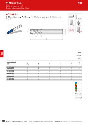 d dA TiA70 l AFH VHM-Schaftfräser AFH Solid carbide end-mill Fraise carbure monobloc à tige AFH508.1-… 6-8 Schneiden, lange Ausführung / 6-8 flutes, long design / 6-8 dents, version longue HA 206 – 223 45° 6-8 Feinstkorn Ultra micro granulation Grain ultra fin l1 PG 24 beschichtet coated revêtu Schaft DIN 6535HA Shank d dA l1 l z Tige -0,02 h6 AFH50861-060 6 6 13 57 6 AFH50861-080 8 8 19 63 6 AFH50861-100 10 10 22 72 6 AFH50861-120 12 12 26 83 6 AFH50861-140 14 14 26 83 6 AFH50861-160 16 16 32 92 6 AFH50881-180 18 18 32 92 8 AFH50881-200 20 20 38 104 8 AFH50881-250 25 25 44 104 8 Hauptanwendung Main application Application principale Nebenanwendung Secondary application Application secondaire 202 VHM- / PM-HSS Werkzeuge | Solid carbide- / PM-HSS Tools | Outils carbure monobloc / PM-HSS Alle Angaben in mm / Dimensions in mm / Toutes les dimensions en mm