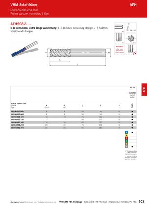 d dA TiA70 AFH l VHM-Schaftfräser AFH Solid carbide end-mill Fraise carbure monobloc à tige AFH508.2-… 6-8 Schneiden, extra lange Ausführung / 6-8 flutes, extra long design / 6-8 dents, version extra longue HA 206 – 223 45° 6-8 Feinstkorn Ultra micro granulation Grain ultra fin l1 PG 24 beschichtet coated revêtu Schaft DIN 6535HA Shank d dA l1 l z Tige -0,03 h6 AFH50862-060 6 6 26 70 6 AFH50862-080 8 8 36 90 6 AFH50862-100 10 10 46 100 6 AFH50862-120 12 12 56 110 6 AFH50862-160 16 16 66 130 6 AFH50882-200 20 20 76 140 8 AFH50882-250 25 25 92 180 8 Hauptanwendung Main application Application principale Nebenanwendung Secondary application Application secondaire Alle Angaben in mm / Dimensions in mm / Toutes les dimensions en mm VHM- / PM-HSS Werkzeuge | Solid carbide- / PM-HSS Tools | Outils carbure monobloc / PM-HSS 203