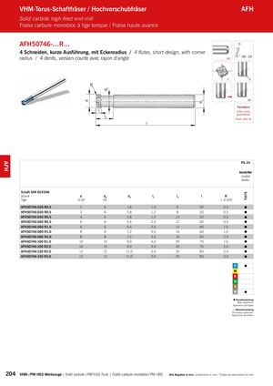 d d3 dA TiA70 l AFH VHM-Torus-Schaftfräser / Hochvorschubfräser AFH Solid carbide high-feed end-mill Fraise carbure monobloc à tige torique / Fraise haute avance AFH50746-…R… 4 Schneiden, kurze Ausführung, mit Eckenradius / 4 flutes, short design, with corner radius / 4 dents, version courte avec rayon d‘angle HA 206 – 223 4 R R 90° l1 FeinstkornUltra micro l2 granulationGrain ultra fin PG 24 beschichtet coated revêtu Schaft DIN 6535HA Shank d dA d3 l1 l2 l R Tige -0,02 h6 ± 0,005 AFH50746-020 R0.5 2 6 1,8 1,0 6 50 0,5 AFH50746-030 R0.5 3 6 2,8 1,2 8 50 0,5 AFH50746-040 R0.5 4 6 3,8 1,5 10 50 0,5 AFH50746-060 R0.5 6 6 5,4 2,5 12 60 0,5 AFH50746-060 R1.0 6 6 5,4 2,5 12 60 1,0 AFH50746-080 R1.0 8 8 7,2 3,5 16 60 1,0 AFH50746-080 R2.0 8 8 7,2 3,5 16 60 2,0 AFH50746-100 R1.0 10 10 9,0 4,0 20 70 1,0 AFH50746-100 R2.0 10 10 9,0 4,0 20 70 2,0 AFH50746-120 R2.0 12 12 11,0 5,0 25 80 2,0 AFH50746-120 R3.0 12 12 11,0 5,0 25 80 3,0 Hauptanwendung Main application Application principale Nebenanwendung Secondary application Application secondaire 204 VHM- / PM-HSS Werkzeuge | Solid carbide- / PM-HSS Tools | Outils carbure monobloc / PM-HSS Alle Angaben in mm / Dimensions in mm / Toutes les dimensions en mm