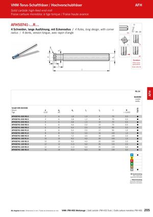 d d3 dA TiA70 AFH l VHM-Torus-Schaftfräser / Hochvorschubfräser AFH Solid carbide high-feed end-mill Fraise carbure monobloc à tige torique / Fraise haute avance AFH50741-…R… 4 Schneiden, lange Ausführung, mit Eckenradius / 4 flutes, long design, with corner radius / 4 dents, version longue, avec rayon d‘angle HA 206 – 223 4 R R 90° Feinstkorn l1 l2 Ultra microgranulationGrain ultra fin PG 24 beschichtet coated revêtu Schaft DIN 6535HA Shank d dA d3 l1 l2 l R Tige -0,02 h6 ± 0,005 AFH50741-020 R0.5 2 6 1,8 1,0 6 70 0,5 AFH50741-030 R0.5 3 6 2,8 1,2 8 70 0,5 AFH50741-040 R0.5 4 6 3,8 1,5 10 70 0,5 AFH50741-050 R0.5 5 6 4,6 2,0 10 70 0,5 AFH50741-060 R0.5 6 6 5,4 2,5 12 90 0,5 AFH50741-060 R1.0 6 6 5,4 2,5 12 90 1,0 AFH50741-080 R1.0 8 8 7,2 3,5 16 100 1,0 AFH50741-080 R2.0 8 8 7,2 3,5 16 100 2,0 AFH50741-100 R1.0 10 10 9,0 4,0 20 100 1,0 AFH50741-100 R2.0 10 10 9,0 4,0 20 100 2,0 AFH50741-120 R2.0 12 12 11,0 5,0 25 110 2,0 AFH50741-120 R3.0 12 12 11,0 5,0 25 110 3,0 AFH50741-160 R3.0 16 16 15,0 6,5 30 130 3,0 Hauptanwendung Main application Application principale Nebenanwendung Secondary application Application secondaire Alle Angaben in mm / Dimensions in mm / Toutes les dimensions en mm VHM- / PM-HSS Werkzeuge | Solid carbide- / PM-HSS Tools | Outils carbure monobloc / PM-HSS 205