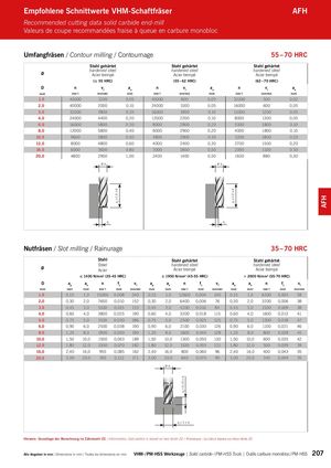 ap≤1,5 x d ap=0,15 x d1 ap≤1,0 x d AFH Empfohlene Schnittwerte VHM-Schaftfräser AFH Recommended cutting data solid carbide end-mill Valeurs de coupe recommandées fraise à queue en carbure monobloc Umfangfräsen / Contour milling / Contournage 55 – 70 HRC Stahl gehärtet Stahl gehärtet Stahl gehärtet hardened steel hardened steel hardened steel Ø Acier trempé Acier trempé Acier trempé (≤ 55 HRC) (55 – 62 HRC) (62 – 70 HRC) D n vf ae n vf ae n vf ae [mm] [min-1] [mm/min] [mm] [min-1] [mm/min] [mm] [min-1] [mm/min] [mm] 1,0 40000 1200 0,05 40000 800 0,03 32000 500 0,02 2,0 40000 2000 0,10 24000 1000 0,05 16000 600 0,05 3,0 32000 3800 0,20 16000 1900 0,10 11000 1200 0,05 4,0 24000 4400 0,20 12000 2200 0,10 8000 1300 0,05 6,0 16000 5800 0,30 8000 2900 0,20 5300 1800 0,10 8,0 12000 5800 0,40 6000 2900 0,20 4000 1800 0,10 10,0 9600 5800 0,50 4800 2900 0,30 3200 1800 0,20 12,0 8000 4800 0,60 4000 2400 0,30 2700 1500 0,20 16,0 6000 3600 0,80 3000 1800 0,50 2000 1100 0,30 20,0 4800 2900 1,00 2400 1400 0,50 1600 880 0,30 Ød Ød ae ae Nutfräsen / Slot milling / Rainurage 35 – 70 HRC Stahl Stahl gehärtet Stahl gehärtet Steel hardened steel hardened steel Ø Acier Acier trempé Acier trempé ≤ 1400 N/mm2 (35-45 HRC) ≤ 1950 N/mm2 (45-55 HRC) > 2000 N/mm2 (55-70 HRC) D ap ae n fz vf ap ae n fz vf ap ae n fz vf [mm] [mm] [mm] [min-1] [mm] [mm/min] [mm] [mm] [min-1] [mm] [mm/min] [mm] [mm] [min-1] [mm] [mm/min] 1,0 0,15 1,0 15000 0,008 240 0,15 1,0 12600 0,004 100 0,15 1,0 6300 0,003 38 2,0 0,30 2,0 7600 0,010 152 0,30 2,0 6400 0,006 76 0,30 2,0 3200 0,006 38 3,0 0,45 3,0 5100 0,015 153 0,45 3,0 4200 0,010 84 0,45 3,0 2100 0,009 38 4,0 0,60 4,0 3800 0,025 190 0,60 4,0 3200 0,018 115 0,60 4,0 1600 0,013 41 5,0 0,75 5,0 3100 0,030 186 0,75 5,0 2500 0,025 125 0,75 5,0 1300 0,018 47 6,0 0,90 6,0 2500 0,038 190 0,90 6,0 2100 0,030 126 0,90 6,0 1100 0,021 46 8,0 1,20 8,0 1900 0,050 190 1,20 8,0 1600 0,040 128 1,20 8,0 800 0,028 45 10,0 1,50 10,0 1500 0,063 189 1,50 10,0 1300 0,050 130 1,50 10,0 600 0,035 42 12,0 1,80 12,0 1300 0,070 182 1,80 12,0 1100 0,055 121 1,80 12,0 500 0,039 39 16,0 2,40 16,0 955 0,085 162 2,40 16,0 800 0,060 96 2,40 16,0 400 0,043 35 20,0 3,00 20,0 765 0,112 171 3,00 20,0 640 0,070 90 3,00 20,0 340 0,049 35 Ø d1 ae=1 x d1 Hinweis: Grundlage der Berechnung ist Zähnezahl Z2 / Information: Calculation is based on two tooth Z2 / Remarque : Le calcul repose sur deux dents Z2 Alle Angaben in mm / Dimensions in mm / Toutes les dimensions en mm VHM- / PM-HSS Werkzeuge | Solid carbide- / PM-HSS Tools | Outils carbure monobloc / PM-HSS 207
