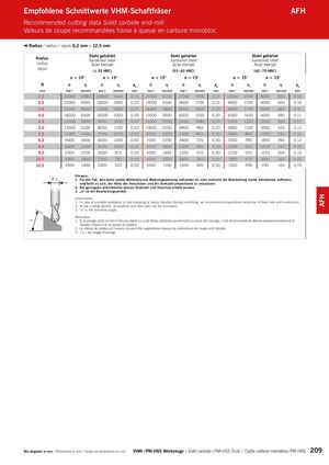 α AFH Empfohlene Schnittwerte VHM-Schaftfräser AFH Recommended cutting data Solid carbide end-mill Valeurs de coupe recommandées fraise à queue en carbure monobloc ➜ Radius / radius / rayon 0,2 mm – 12,5 mm Radius Stahl gehärtethardened steel Stahl gehärtethardened steel Stahl gehärtethardened steel radius Acier trempé Acier trempé Acier trempé rayon (≤ 55 HRC) (55 – 62 HRC) (62 – 70 HRC) α < 15° α > 15° α < 15° α > 15° α < 15° α > 15° R n vf n vf ap n vf n vf ap n vf n vf ap [mm] [min-1] [mm/min] [min-1] [mm/min] [mm] [min-1] [mm/min] [min-1] [mm/min] [mm] [min-1] [mm/min] [min-1] [mm/min] [mm] 2,0 32000 10880 20000 3600 0,15 24000 6200 12000 1900 0,13 12000 2400 8000 800 0,10 2,5 25000 9000 16000 2900 0,20 19000 5300 9600 1700 0,15 9600 2100 6000 600 0,10 3,0 21000 8400 13000 2600 0,25 16000 4800 8000 1600 0,20 8000 1700 5000 600 0,11 4,0 16000 6400 10000 2000 0,30 12000 3600 6000 1200 0,20 6000 1400 4000 480 0,11 4,5 14500 5800 9000 1800 0,40 11000 3300 5400 1080 0,20 5400 1200 3500 450 0,11 5,0 13000 5200 8000 1700 0,50 10000 3200 4800 960 0,20 4800 1100 3000 420 0,12 5,5 11000 4400 7000 1450 0,50 8500 2550 4200 840 0,30 3600 860 2200 310 0,12 6,0 9000 3600 6000 1300 0,50 7000 2200 3600 720 0,30 3000 780 1850 290 0,12 8,0 6000 2400 4000 1000 0,50 5000 1600 2500 500 0,30 2500 650 1500 240 0,15 9,0 5500 2200 3500 875 0,50 4500 1400 2100 420 0,30 2200 570 1250 200 0,15 10,0 4500 1800 3000 780 0,50 4000 1300 1800 360 0,30 1800 470 1000 160 0,15 12,5 3500 1400 2000 520 0,50 3500 1100 1500 300 0,30 1500 390 700 105 0,15 Hinweis: Ø d1 1. Für den Fall, dass keine stabile Werkstück-und Werkzeugspannung vorhanden ist, oder während der Bearbeitung starke Vibrationen auftreten, empfiehlt es sich, die Höhe des Vorschubes und die Drehzahl proportional zu reduzieren. 2. Bei geringeren Schnitttiefen können Drehzahl und Vorschub erhöht werden. 3. „α“ ist der Bearbeitungswinkel. Information: 1. In case of unstable workpiece or tool clamping or heavy vibration during machining, we recommend proportional reduction of feed rate and revolutions. 2. At low cutting depths, revolutions and feed rate can be increased. 3. “α” is the machine angle. Remarque : 1. Si le serrage pièce et outil n’est pas stable ou si de fortes vibrations surviennent au cours de l’usinage, il est recommandé de réduire proportionnellement la hauteur d’avance et la vitesse de rotation. 2. La vitesse de rotation et l’avance peuvent être augmentées lorsque les profondeurs de coupe sont réduites. 3. « α » est l’angle d’usinage. Alle Angaben in mm / Dimensions in mm / Toutes les dimensions en mm VHM- / PM-HSS Werkzeuge | Solid carbide- / PM-HSS Tools | Outils carbure monobloc / PM-HSS 209