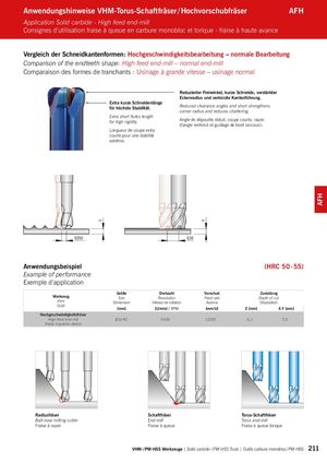 z z AFH Anwendungshinweise VHM-Torus-Schaftfräser / Hochvorschubfräser AFH Application Solid carbide - High feed end-mill Consignes d’utilisation fraise à queue en carbure monobloc et torique - fraise à haute avance Vergleich der Schneidkantenformen: Hochgeschwindigkeitsbearbeitung – normale Bearbeitung Comparison of the endteeth shape: High feed end-mill – normal end-mill Comparaison des formes de tranchants : Usinage à grande vitesse – usinage normal Reduzierter Freiwinkel, kurze Schneide, verstärkter Eckenradius und verkürzte Kantenführung. Extra kurze Schneidenlängefür höchste Stabilität.Reduced clearance angles and short strengthenscorner radius and reduces chattering. Extra short flutes lengthfor high rigidity.Angle de dépouille réduit, coupe courte, rayond’angle renforcé et guidage de bord raccourci. Longueur de coupe extra courte pour une stabilité extrême. 0,05d 0,3d Anwendungsbeispiel (HRC 50 - 55) Example of performance Exemple d’application Größe Drehzahl Vorschub Zustellung Werkzeug Size Revolution Feed rate Depth of cut Item Dimension Vitesse de rotation Avance Disposition Outil [mm] [U/min] / RPM [mm/U] Z [mm] X-Y [mm] Hochgeschwindigkeitsfräser High feed end-mill Ø10 R2 5400 11000 0,2 3,0 Fraise à grande vitesse Radiusfräser Schaftfräser Torus-Schaftfräser Ball-nose milling cutter End-mill Torus end-mill Fraise à rayon Fraise à queue Fraise à queue torique VHM- / PM-HSS Werkzeuge | Solid carbide- / PM-HSS Tools | Outils carbure monobloc / PM-HSS 211