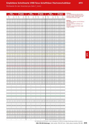 AFH Empfohlene Schnittwerte VHM-Torus-Schaftfräser / Hochvorschubfräser AFH Richtwerte für den Vorschub pro Zahn fz [mm] Mitteld1=10 mm Schruppend1=10 mm Mitteld1=12 mm Schruppend1=12 mm Mitteld1=16 mm Schruppend1=16 mm Achtung:Die Eingriffsbreite ae sollte bei Stahl60 - 90% und bei Edelstählen die zum ap[mm] fz[mm] ap [mm] fz [mm] ap [mm] fz[mm] ap [mm] fz [mm] ap [mm] fz [mm] ap [mm] fz [mm] Aufkleben neigen, maximal 40% desFräsungsdurchmessers liegen. 0,1 - 0,2 0,1 - 0,4 0,2 - 0,3 0,4 - 0,7 0,1 - 0,2 0,1 - 0,45 0,2 - 0,3 0,45 - 0,8 0,25 - 0,4 0,45 - 0,8 0,1 - 0,25 0,1 - 0,45 0,1 - 0,2 0,1 - 0,4 0,2 - 0,3 0,4 - 0,7 0,1 - 0,2 0,1 - 0,45 0,2 - 0,3 0,45 - 0,8 0,25 - 0,4 0,45 - 0,8 0,1 - 0,25 0,1 - 0,45 Kühlung 0,1 - 0,2 0,1 - 0,4 0,2 - 0,3 0,4 - 0,7 0,1 - 0,2 0,1 - 0,45 0,2 - 0,3 0,45 - 0,8 0,25 - 0,4 0,45 - 0,8 0,1 - 0,25 0,1 - 0,45 Bei rostfreien Stählen und NE-Metallenmit Emulsionen. 0,1 - 0,2 0,1 - 0,25 0,2 - 0,3 0,25 - 0,4 0,1 - 0,2 0,1 - 0,35 0,2 - 0,3 0,35 - 0,6 0,25 - 0,4 0,35 - 0,6 0,1 - 0,25 0,1 - 0,35 Bei Guss- und beim Hartfräsen mit 0,1 - 0,2 0,1 - 0,25 0,2 - 0,3 0,25 - 0,4 0,1 - 0,2 0,1 - 0,35 0,2 - 0,3 0,35 - 0,6 0,25 - 0,4 0,35 - 0,6 0,1 - 0,25 0,1 - 0,35 Druckluft.Bei Stahl- und hochwarmfesten Legie- 0,1 - 0,2 0,1 - 0,25 0,2 - 0,3 0,25 - 0,4 0,1 - 0,2 0,1 - 0,35 0,2 - 0,3 0,35 - 0,6 0,25 - 0,4 0,35 - 0,6 0,1 - 0,25 0,1 - 0,35 rungen mit MMS. 0,1 - 0,2 0,1 - 0,25 0,2 - 0,3 0,25 - 0,4 0,1 - 0,2 0,1 - 0,35 0,2 - 0,3 0,35 - 0,6 0,25 - 0,4 0,35 - 0,6 0,1 - 0,25 0,1 - 0,35 0,1 - 0,2 0,1 - 0,25 0,2 - 0,3 0,25 - 0,4 0,1 - 0,2 0,1 - 0,35 0,2 - 0,3 0,35 - 0,6 0,25 - 0,4 0,35 - 0,6 0,1 - 0,25 0,1 - 0,35 0,1 - 0,2 0,1 - 0,25 0,2 - 0,3 0,25 - 0,4 0,1 - 0,2 0,1 - 0,35 0,2 - 0,3 0,35 - 0,6 0,25 - 0,4 0,35 - 0,6 0,1 - 0,25 0,1 - 0,35 0,1 - 0,2 0,1 - 0,25 0,2 - 0,3 0,25 - 0,4 0,1 - 0,2 0,1 - 0,35 0,2 - 0,3 0,35 - 0,6 0,25 - 0,4 0,35 - 0,6 0,1 - 0,25 0,1 - 0,35 0,1 - 0,2 0,1 - 0,25 0,2 - 0,3 0,25 - 0,4 0,1 - 0,2 0,1 - 0,35 0,2 - 0,3 0,35 - 0,6 0,25 - 0,4 0,35 - 0,6 0,1 - 0,25 0,1 - 0,35 0,1 - 0,2 0,1 - 0,25 0,2 - 0,3 0,25 - 0,4 0,1 - 0,2 0,1 - 0,35 0,2 - 0,3 0,35 - 0,6 0,25 - 0,4 0,35 - 0,6 0,1 - 0,25 0,1 - 0,35 0,1 - 0,2 0,1 - 0,25 0,2 - 0,3 0,25 - 0,4 0,1 - 0,2 0,1 - 0,35 0,2 - 0,3 0,35 - 0,6 0,25 - 0,4 0,35 - 0,6 0,1 - 0,25 0,1 - 0,35 0,1 - 0,2 0,1 - 0,25 0,2 - 0,3 0,25 - 0,4 0,1 - 0,2 0,1 - 0,35 0,2 - 0,3 0,35 - 0,6 0,25 - 0,4 0,35 - 0,6 0,1 - 0,25 0,1 - 0,35 0,1 - 0,2 0,1 - 0,25 0,2 - 0,3 0,25 - 0,4 0,1 - 0,2 0,1 - 0,35 0,2 - 0,3 0,35 - 0,6 0,25 - 0,4 0,35 - 0,6 0,1 - 0,25 0,1 - 0,35 0,1 - 0,2 0,1 - 0,25 0,2 - 0,3 0,25 - 0,4 0,1 - 0,2 0,1 - 0,35 0,2 - 0,3 0,35 - 0,6 0,25 - 0,4 0,35 - 0,6 0,1 - 0,25 0,1 - 0,35 0,1 - 0,2 0,1 - 0,25 0,2 - 0,3 0,25 - 0,4 0,1 - 0,2 0,1 - 0,35 0,2 - 0,3 0,35 - 0,6 0,25 - 0,4 0,35 - 0,6 0,1 - 0,25 0,1 - 0,35 0,1 - 0,2 0,1 - 0,25 0,2 - 0,3 0,25 - 0,4 0,1 - 0,2 0,1 - 0,35 0,2 - 0,3 0,35 - 0,6 0,25 - 0,4 0,35 - 0,6 0,1 - 0,25 0,1 - 0,35 0,1 - 0,2 0,1 - 0,25 0,2 - 0,3 0,25 - 0,4 0,1 - 0,2 0,1 - 0,35 0,2 - 0,3 0,35 - 0,6 0,25 - 0,4 0,35 - 0,6 0,1 - 0,25 0,1 - 0,35 0,1 - 0,2 0,1 - 0,25 0,2 - 0,3 0,25 - 0,4 0,1 - 0,2 0,1 - 0,35 0,2 - 0,3 0,35 - 0,6 0,25 - 0,4 0,35 - 0,6 0,1 - 0,25 0,1 - 0,35 0,1 - 0,2 0,1 - 0,25 0,2 - 0,3 0,25 - 0,4 0,1 - 0,2 0,1 - 0,35 0,2 - 0,3 0,35 - 0,6 0,25 - 0,4 0,35 - 0,6 0,1 - 0,25 0,1 - 0,35 0,1 - 0,2 0,1 - 0,25 0,2 - 0,3 0,25 - 0,4 0,1 - 0,2 0,1 - 0,35 0,2 - 0,3 0,35 - 0,6 0,25 - 0,4 0,35 - 0,6 0,1 - 0,25 0,1 - 0,35 0,1 - 0,2 0,1 - 0,25 0,2 - 0,3 0,25 - 0,4 0,1 - 0,2 0,1 - 0,35 0,2 - 0,3 0,35 - 0,6 0,25 - 0,4 0,35 - 0,6 0,1 - 0,25 0,1 - 0,35 0,1 - 0,2 0,1 - 0,4 0,2 - 0,3 0,4 - 0,7 0,1 - 0,2 0,1 - 0,45 0,2 - 0,3 0,45 - 0,8 0,25 - 0,4 0,45 - 0,8 0,1 - 0,25 0,1 - 0,45 0,1 - 0,2 0,1 - 0,4 0,2 - 0,3 0,4 - 0,7 0,1 - 0,2 0,1 - 0,45 0,2 - 0,3 0,45 - 0,8 0,25 - 0,4 0,45 - 0,8 0,1 - 0,25 0,1 - 0,45 0,1 - 0,2 0,1 - 0,25 0,2 - 0,3 0,25 - 0,4 0,1 - 0,2 0,1 - 0,35 0,2 - 0,3 0,35 - 0,6 0,2 - 0,3 0,35 - 0,6 0,1 - 0,2 0,1 - 0,35 0,1 - 0,2 0,1 - 0,25 0,2 - 0,3 0,25 - 0,4 0,1 - 0,2 0,1 - 0,35 0,2 - 0,3 0,35 - 0,6 0,2 - 0,3 0,35 - 0,6 0,1 - 0,2 0,1 - 0,35 0,1 - 0,2 0,1 - 0,25 0,2 - 0,3 0,25 - 0,4 0,1 - 0,2 0,1 - 0,35 0,2 - 0,3 0,35 - 0,6 0,2 - 0,3 0,35 - 0,6 0,1 - 0,2 0,1 - 0,35 0,1 - 0,2 0,1 - 0,25 0,2 - 0,3 0,25 - 0,4 0,1 - 0,2 0,1 - 0,35 0,2 - 0,3 0,35 - 0,6 0,2 - 0,3 0,35 - 0,6 0,1 - 0,2 0,1 - 0,35 0,1 - 0,2 0,1 - 0,25 0,2 - 0,3 0,25 - 0,4 0,1 - 0,2 0,1 - 0,35 0,2 - 0,3 0,35 - 0,6 0,2 - 0,3 0,35 - 0,6 0,1 - 0,2 0,1 - 0,35 0,1 - 0,2 0,1 - 0,25 0,2 - 0,3 0,25 - 0,4 0,1 - 0,2 0,1 - 0,35 0,2 - 0,3 0,35 - 0,6 0,2 - 0,3 0,35 - 0,6 0,1 - 0,2 0,1 - 0,35 0,1 - 0,2 0,1 - 0,4 0,2 - 0,3 0,4 - 0,7 0,1 - 0,2 0,1 - 0,45 0,2 - 0,3 0,45 - 0,8 0,25 - 0,4 0,45 - 0,8 0,1 - 0,25 0,1 - 0,45 0,1 - 0,2 0,1 - 0,4 0,2 - 0,3 0,4 - 0,7 0,1 - 0,2 0,1 - 0,45 0,2 - 0,3 0,45 - 0,8 0,25 - 0,4 0,45 - 0,8 0,1 - 0,25 0,1 - 0,45 0,1 - 0,2 0,1 - 0,4 0,2 - 0,3 0,4 - 0,7 0,1 - 0,2 0,1 - 0,45 0,2 - 0,3 0,45 - 0,8 0,25 - 0,4 0,45 - 0,8 0,1 - 0,25 0,1 - 0,45 0,1 - 0,2 0,1 - 0,4 0,2 - 0,3 0,4 - 0,7 0,1 - 0,2 0,1 - 0,45 0,2 - 0,3 0,45 - 0,8 0,25 - 0,4 0,45 - 0,8 0,1 - 0,25 0,1 - 0,45 0,1 - 0,2 0,1 - 0,4 0,2 - 0,3 0,4 - 0,7 0,1 - 0,2 0,1 - 0,45 0,2 - 0,3 0,45 - 0,8 0,25 - 0,4 0,45 - 0,8 0,1 - 0,25 0,1 - 0,45 0,1 - 0,2 0,1 - 0,4 0,2 - 0,3 0,4 - 0,7 0,1 - 0,2 0,1 - 0,45 0,2 - 0,3 0,45 - 0,8 0,25 - 0,4 0,45 - 0,8 0,1 - 0,25 0,1 - 0,45 0,1 - 0,2 0,1 - 0,4 0,2 - 0,3 0,4 - 0,7 0,1 - 0,2 0,1 - 0,45 0,2 - 0,3 0,45 - 0,8 0,25 - 0,4 0,45 - 0,8 0,1 - 0,25 0,1 - 0,45 0,1 - 0,2 0,1 - 0,4 0,2 - 0,3 0,4 - 0,7 0,1 - 0,2 0,1 - 0,45 0,2 - 0,3 0,45 - 0,8 0,25 - 0,4 0,45 - 0,8 0,1 - 0,25 0,1 - 0,45 0,1 - 0,2 0,1 - 0,4 0,2 - 0,3 0,4 - 0,7 0,1 - 0,2 0,1 - 0,45 0,2 - 0,3 0,45 - 0,8 0,25 - 0,4 0,45 - 0,8 0,1 - 0,25 0,1 - 0,45 0,1 - 0,2 0,1 - 0,4 0,2 - 0,3 0,4 - 0,7 0,1 - 0,2 0,1 - 0,45 0,2 - 0,3 0,45 - 0,8 0,25 - 0,4 0,45 - 0,8 0,1 - 0,25 0,1 - 0,45 0,1 - 0,2 0,1 - 0,4 0,2 - 0,3 0,4 - 0,7 0,1 - 0,2 0,1 - 0,45 0,2 - 0,3 0,45 - 0,8 0,25 - 0,4 0,45 - 0,8 0,1 - 0,25 0,1 - 0,45 0,1 - 0,2 0,1 - 0,4 0,2 - 0,3 0,4 - 0,7 0,