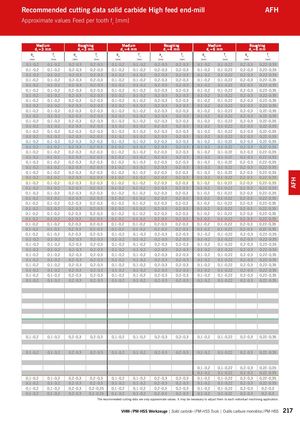 AFH Recommended cutting data solid carbide High feed end-mill AFH Approximate values Feed per tooth fz [mm] Medium Roughing Medium Roughing Medium Roughing d1=3 mm d1=3 mm d1=4 mm d1=4 mm d1=6 mm d1=6 mm ap fz ap fz ap fz ap fz ap fz ap fz [mm] [mm] [mm] [mm] [mm] [mm] [mm] [mm] [mm] [mm] [mm] [mm] 0,1 - 0,2 0,1 - 0,2 0,2 - 0,3 0,2 - 0,3 0,1 - 0,2 0,1 - 0,2 0,2 - 0,3 0,2 - 0,3 0,1 - 0,2 0,1 - 0,22 0,2 - 0,3 0,22 - 0,35 0,1 - 0,2 0,1 - 0,2 0,2 - 0,3 0,2 - 0,3 0,1 - 0,2 0,1 - 0,2 0,2 - 0,3 0,2 - 0,3 0,1 - 0,2 0,1 - 0,22 0,2 - 0,3 0,22 - 0,35 0,1 - 0,2 0,1 - 0,2 0,2 - 0,3 0,2 - 0,3 0,1 - 0,2 0,1 - 0,2 0,2 - 0,3 0,2 - 0,3 0,1 - 0,2 0,1 - 0,22 0,2 - 0,3 0,22 - 0,35 0,1 - 0,2 0,1 - 0,2 0,2 - 0,3 0,2 - 0,3 0,1 - 0,2 0,1 - 0,2 0,2 - 0,3 0,2 - 0,3 0,1 - 0,2 0,1 - 0,22 0,2 - 0,3 0,22 - 0,35 0,1 - 0,2 0,1 - 0,2 0,2 - 0,3 0,2 - 0,3 0,1 - 0,2 0,1 - 0,2 0,2 - 0,3 0,2 - 0,3 0,1 - 0,2 0,1 - 0,22 0,2 - 0,3 0,22 - 0,35 0,1 - 0,2 0,1 - 0,2 0,2 - 0,3 0,2 - 0,3 0,1 - 0,2 0,1 - 0,2 0,2 - 0,3 0,2 - 0,3 0,1 - 0,2 0,1 - 0,22 0,2 - 0,3 0,22 - 0,35 0,1 - 0,2 0,1 - 0,2 0,2 - 0,3 0,2 - 0,3 0,1 - 0,2 0,1 - 0,2 0,2 - 0,3 0,2 - 0,3 0,1 - 0,2 0,1 - 0,22 0,2 - 0,3 0,22 - 0,35 0,1 - 0,2 0,1 - 0,2 0,2 - 0,3 0,2 - 0,3 0,1 - 0,2 0,1 - 0,2 0,2 - 0,3 0,2 - 0,3 0,1 - 0,2 0,1 - 0,22 0,2 - 0,3 0,22 - 0,35 0,1 - 0,2 0,1 - 0,2 0,2 - 0,3 0,2 - 0,3 0,1 - 0,2 0,1 - 0,2 0,2 - 0,3 0,2 - 0,3 0,1 - 0,2 0,1 - 0,22 0,2 - 0,3 0,22 - 0,35 0,1 - 0,2 0,1 - 0,2 0,2 - 0,3 0,2 - 0,3 0,1 - 0,2 0,1 - 0,2 0,2 - 0,3 0,2 - 0,3 0,1 - 0,2 0,1 - 0,22 0,2 - 0,3 0,22 - 0,35 0,1 - 0,2 0,1 - 0,2 0,2 - 0,3 0,2 - 0,3 0,1 - 0,2 0,1 - 0,2 0,2 - 0,3 0,2 - 0,3 0,1 - 0,2 0,1 - 0,22 0,2 - 0,3 0,22 - 0,35 0,1 - 0,2 0,1 - 0,2 0,2 - 0,3 0,2 - 0,3 0,1 - 0,2 0,1 - 0,2 0,2 - 0,3 0,2 - 0,3 0,1 - 0,2 0,1 - 0,22 0,2 - 0,3 0,22 - 0,35 0,1 - 0,2 0,1 - 0,2 0,2 - 0,3 0,2 - 0,3 0,1 - 0,2 0,1 - 0,2 0,2 - 0,3 0,2 - 0,3 0,1 - 0,2 0,1 - 0,22 0,2 - 0,3 0,22 - 0,35 0,1 - 0,2 0,1 - 0,2 0,2 - 0,3 0,2 - 0,3 0,1 - 0,2 0,1 - 0,2 0,2 - 0,3 0,2 - 0,3 0,1 - 0,2 0,1 - 0,22 0,2 - 0,3 0,22 - 0,35 0,1 - 0,2 0,1 - 0,2 0,2 - 0,3 0,2 - 0,3 0,1 - 0,2 0,1 - 0,2 0,2 - 0,3 0,2 - 0,3 0,1 - 0,2 0,1 - 0,22 0,2 - 0,3 0,22 - 0,35 0,1 - 0,2 0,1 - 0,2 0,2 - 0,3 0,2 - 0,3 0,1 - 0,2 0,1 - 0,2 0,2 - 0,3 0,2 - 0,3 0,1 - 0,2 0,1 - 0,22 0,2 - 0,3 0,22 - 0,35 0,1 - 0,2 0,1 - 0,2 0,2 - 0,3 0,2 - 0,3 0,1 - 0,2 0,1 - 0,2 0,2 - 0,3 0,2 - 0,3 0,1 - 0,2 0,1 - 0,22 0,2 - 0,3 0,22 - 0,35 0,1 - 0,2 0,1 - 0,2 0,2 - 0,3 0,2 - 0,3 0,1 - 0,2 0,1 - 0,2 0,2 - 0,3 0,2 - 0,3 0,1 - 0,2 0,1 - 0,22 0,2 - 0,3 0,22 - 0,35 0,1 - 0,2 0,1 - 0,2 0,2 - 0,3 0,2 - 0,3 0,1 - 0,2 0,1 - 0,2 0,2 - 0,3 0,2 - 0,3 0,1 - 0,2 0,1 - 0,22 0,2 - 0,3 0,22 - 0,35 0,1 - 0,2 0,1 - 0,2 0,2 - 0,3 0,2 - 0,3 0,1 - 0,2 0,1 - 0,2 0,2 - 0,3 0,2 - 0,3 0,1 - 0,2 0,1 - 0,22 0,2 - 0,3 0,22 - 0,35 0,1 - 0,2 0,1 - 0,2 0,2 - 0,3 0,2 - 0,3 0,1 - 0,2 0,1 - 0,2 0,2 - 0,3 0,2 - 0,3 0,1 - 0,2 0,1 - 0,22 0,2 - 0,3 0,22 - 0,35 0,1 - 0,2 0,1 - 0,2 0,2 - 0,3 0,2 - 0,3 0,1 - 0,2 0,1 - 0,2 0,2 - 0,3 0,2 - 0,3 0,1 - 0,2 0,1 - 0,22 0,2 - 0,3 0,22 - 0,35 0,1 - 0,2 0,1 - 0,2 0,2 - 0,3 0,2 - 0,3 0,1 - 0,2 0,1 - 0,2 0,2 - 0,3 0,2 - 0,3 0,1 - 0,2 0,1 - 0,22 0,2 - 0,3 0,22 - 0,35 0,1 - 0,2 0,1 - 0,2 0,2 - 0,3 0,2 - 0,3 0,1 - 0,2 0,1 - 0,2 0,2 - 0,3 0,2 - 0,3 0,1 - 0,2 0,1 - 0,22 0,2 - 0,3 0,22 - 0,35 0,1 - 0,2 0,1 - 0,2 0,2 - 0,3 0,2 - 0,3 0,1 - 0,2 0,1 - 0,2 0,2 - 0,3 0,2 - 0,3 0,1 - 0,2 0,1 - 0,22 0,2 - 0,3 0,22 - 0,35 0,1 - 0,2 0,1 - 0,2 0,2 - 0,3 0,2 - 0,3 0,1 - 0,2 0,1 - 0,2 0,2 - 0,3 0,2 - 0,3 0,1 - 0,2 0,1 - 0,22 0,2 - 0,3 0,22 - 0,35 0,1 - 0,2 0,1 - 0,2 0,2 - 0,3 0,2 - 0,3 0,1 - 0,2 0,1 - 0,2 0,2 - 0,3 0,2 - 0,3 0,1 - 0,2 0,1 - 0,22 0,2 - 0,3 0,22 - 0,35 0,1 - 0,2 0,1 - 0,2 0,2 - 0,3 0,2 - 0,3 0,1 - 0,2 0,1 - 0,2 0,2 - 0,3 0,2 - 0,3 0,1 - 0,2 0,1 - 0,22 0,2 - 0,3 0,22 - 0,35 0,1 - 0,2 0,1 - 0,2 0,2 - 0,3 0,2 - 0,3 0,1 - 0,2 0,1 - 0,2 0,2 - 0,3 0,2 - 0,3 0,1 - 0,2 0,1 - 0,22 0,2 - 0,3 0,22 - 0,35 0,1 - 0,2 0,1 - 0,2 0,2 - 0,3 0,2 - 0,3 0,1 - 0,2 0,1 - 0,2 0,2 - 0,3 0,2 - 0,3 0,1 - 0,2 0,1 - 0,22 0,2 - 0,3 0,22 - 0,35 0,1 - 0,2 0,1 - 0,2 0,2 - 0,3 0,2 - 0,3 0,1 - 0,2 0,1 - 0,2 0,2 - 0,3 0,2 - 0,3 0,1 - 0,2 0,1 - 0,22 0,2 - 0,3 0,22 - 0,35 0,1 - 0,2 0,1 - 0,2 0,2 - 0,3 0,2 - 0,3 0,1 - 0,2 0,1 - 0,2 0,2 - 0,3 0,2 - 0,3 0,1 - 0,2 0,1 - 0,22 0,2 - 0,3 0,22 - 0,35 0,1 - 0,2 0,1 - 0,2 0,2 - 0,3 0,2 - 0,3 0,1 - 0,2 0,1 - 0,2 0,2 - 0,3 0,2 - 0,3 0,1 - 0,2 0,1 - 0,22 0,2 - 0,3 0,22 - 0,35 0,1 - 0,2 0,1 - 0,2 0,2 - 0,3 0,2 - 0,3 0,1 - 0,2 0,1 - 0,2 0,2 - 0,3 0,2 - 0,3 0,1 - 0,2 0,1 - 0,22 0,2 - 0,3 0,22 - 0,35 0,1 - 0,2 0,1 - 0,2 0,2 - 0,3 0,2 - 0,3 0,1 - 0,2 0,1 - 0,2 0,2 - 0,3 0,2 - 0,3 0,1 - 0,2 0,1 - 0,22 0,2 - 0,3 0,22 - 0,35 0,1 - 0,2 0,1 - 0,2 0,2 - 0,3 0,2 - 0,3 0,1 - 0,2 0,1 - 0,2 0,2 - 0,3 0,2 - 0,3 0,1 - 0,2 0,1 - 0,22 0,2 - 0,3 0,22 - 0,35 0,1 - 0,2 0,1 - 0,2 0,2 - 0,3 0,2 - 0,3 0,1 - 0,2 0,1 - 0,2 0,2 - 0,3 0,2 - 0,3 0,1 - 0,2 0,1 - 0,22 0,2 - 0,3 0,22 - 0,35 0,1 - 0,2 0,1 - 0,2 0,2 - 0,3 0,2 - 0,3 0,1 - 0,2 0,1 - 0,2 0,2 - 0,3 0,2 - 0,3 0,1 - 0,2 0,1 - 0,22 0,2 - 0,3 0,22 - 0,35 0,1 - 0,2 0,1 - 0,2 0,2 - 0,3 0,2 - 0,3 0,1 - 0,2 0,1 - 0,2 0,2 - 0,3 0,2 - 0,3 0,1 - 0,2 0,1 - 0,22 0,2 - 0,3 0,22 - 0,35 0,1 - 0,2 0,1 - 0,2 0,2 - 0,3 0,2 - 0,3 0,1 - 0,2 0,1 - 0,2 0,2 - 0,3 0,2 - 0,3 0,1 - 0,2 0,1 - 0,22 0,2 - 0,3 0,22 - 0,35 0,1 - 0,2 0,1 - 0,2 0,2 - 0,3 0,2 - 0,3 0,1 - 0,2 0,1 - 0,2 0,2 - 0,3 0,2 - 0,3 0,1 - 0,2 0,1 - 0,22 0,2 - 0,3 0,22 - 0,35 0,1 - 0,2 0,1 - 0,2 0,2 - 0,3 0,2 - 0,3 0,1 - 0,2 0,1 - 0,2 0,2 - 0,3 0,2 - 0,3 0,1 - 0,2 0,1 - 0,22 0,2 - 0,3 0,22 - 0,35 0,1 - 0,2 0,1 - 0,2 0,2 - 0,3 0,2 - 0,3 0,1 - 0,2 0,1 - 0,2 0,2 - 0,3 0,2 - 0,3 0,1 - 0,2 0,1 - 0,22 0,2 - 0,3 0,22 - 0,35 0,1 - 0,2 0,1 - 0,2 0,2 - 0,3 0,2 - 0,3 0,1 - 0,2 0,1 - 0,2 0,2 - 0,3 0,2 - 0,3 0,1 - 0,2 0,1 - 0,22 0,2 - 0,3 0,22 - 0,35 0,1 - 0,2 0,1 - 0,2 0,2 - 0,3 0,2 - 0,3 0,1 - 0,2 0,1 - 0,2 0,2 - 0,3 0,2 - 0,3 0,1 - 0,2 0,1 - 0,22 0,2 - 0,3 0,22 - 0,35 0,1 - 0,2 0,1 - 0,22 0,2 - 0,3 0,22 - 0,35 0,1 - 0,2 0,1 - 0,22 0,2 - 0,3 0,22 - 0,35 0,1 - 0,2 0,1 - 0,2 0,2 - 0,3 0,2 - 0,3 0,1 - 0,2 0,1 - 0,2 0,2 - 0,3 0,2 - 0,3