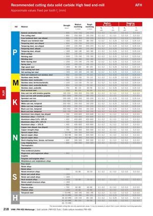 AFH Recommended cutting data solid carbide High feed end-mill AFH Approximate values Feed per tooth fz [mm] ISO Material Strength Medium Roughmachiningmachining[N/mm2]Vc [m/min]Vc [m/min]Mediumd1=8 mmapfz[mm][mm]Roughingd1=8 mmapfz[mm][mm] General construction steel < 800 250 - 300 150 - 250 0,1 - 0,2 0,1 - 0,3 0,2 - 0,3 0,3 - 0,5 Free cutting steel < 800 250 - 300 150 - 250 0,1 - 0,2 0,1 - 0,3 0,2 - 0,3 0,3 - 0,5 Case hardened steel, non alloyed < 800 250 - 300 150 - 250 0,1 - 0,2 0,1 - 0,3 0,2 - 0,3 0,3 - 0,5 Alloyed case hardened steel < 1000 200 - 250 180 - 200 0,1 0,2 0,1 - 0,25 0,2 - 0,3 0,25 - 0,4 Tempering steel, non alloyed < 850 220 - 250 200 - 220 0,1 - 0,2 0,1 - 0,25 0,2 - 0,3 0,25 - 0,4 Tempering steel, non alloyed < 1000 220 - 250 200 - 220 0,1 - 0,2 0,1 - 0,25 0,2 - 0,3 0,25 - 0,4 Tempering steel, alloyed < 800 170 - 190 170 - 190 0,1 - 0,2 0,1 - 0,25 0,2 - 0,3 0,25 - 0,4 P Tempering steel, alloyedSteel castings < 1300 160 - 180 160 - 180 0,1 - 0,2 0,1 - 0,25 0,2 - 0,3 0,25 - 0,4< 850220 - 250200 - 2200,1 - 0,20,1 - 0,250,2 - 0,30,25 - 0,4 Nitriding steel < 1000 170 - 190 170 - 190 0,1 - 0,2 0,1 - 0,25 0,2 - 0,3 0,25 - 0,4 Nitriding steel < 1200 160 - 180 160 - 180 0,1 - 0,2 0,1 - 0,25 0,2 - 0,3 0,25 - 0,4 Roller bearing steel < 1200 170 - 190 170 - 190 0,1 0,2 0,1 - 0,25 0,2 - 0,3 0,25 - 0,4 Spring steel < 1200 100 - 120 100 - 120 0,1 - 0,2 0,1 - 0,25 0,2 - 0,3 0,25 - 0,4 High-speed steel < 1300 80 - 100 80 - 100 0,1 - 0,2 0,1 - 0,25 0,2 - 0,3 0,25 - 0,4 Cold working tool steel < 1300 140 - 180 140 - 180 0,1 - 0,2 0,1 - 0,25 0,2 - 0,3 0,25 - 0,4 Hot working tool steel < 1300 140 - 180 140 - 180 0,1 0,2 0,1 - 0,25 0,2 - 0,3 0,25 - 0,4 Steel and sulphured cast stainless steel < 850 110 - 150 70 - 110 0,1 - 0,2 0,1 - 0,25 0,2 - 0,3 0,25 - 0,4 Stainless steel, ferritic < 750 110 - 150 70 - 110 0,1 - 0,2 0,1 - 0,25 0,2 - 0,3 0,25 - 0,4 M Stainless steel, martensiticStainless steel, ferritic/martensiticStainless steel, austenitic/ferritic< 900110 - 150 70 - 110 0,1 - 0,2 0,1 - 0,25 0,2 - 0,3 0,25 - 0,4< 1100110 - 15070 - 1100,1 - 0,20,1 - 0,250,2 - 0,30,25 - 0,4< 850110 - 15070 - 1100,1 - 0,20,1 - 0,250,2 - 0,30,25 - 0,4 Stainless steel, austenitic < 750 80 - 110 60 - 90 0,1 - 0,2 0,1 - 0,25 0,2 - 0,3 0,25 - 0,4 Heat resistant steel < 1100 80 - 110 60 - 90 0,1 - 0,2 0,1 - 0,25 0,2 - 0,3 0,25 - 0,4 Grey cast iron with lamellar graphite 100 - 350 300 - 350 250 - 300 0,1 - 0,2 0,1 - 0,3 0,2 - 0,3 0,3 - 0,5 Grey cast iron with lamellar graphite 300 - 1000 180 - 250 180 - 250 0,1 - 0,2 0,1 - 0,3 0,2 - 0,3 0,3 - 0,5 Speroidal cast iron 300 - 500 200 - 250 150 - 200 0,1 - 0,2 0,1 - 0,25 0,2 - 0,3 0,25 - 0,4 K Speroidal cast ironWhite cast iron, tempered 550 - 800 200 - 250 150 - 200 0,1 - 0,2 0,1 - 0,25 0,2 - 0,3 0,25 - 0,4350 - 450200 - 250150 - 2000,1 - 0,20,1 - 0,250,2 - 0,30,25 - 0,4 White cast iron, tempered 500 - 650 200 - 250 150 - 200 0,1 - 0,2 0,1 - 0,25 0,2 - 0,3 0,25 - 0,4 Black cast iron, tempered 350 - 450 200 - 250 150 - 200 0,1 - 0,2 0,1 - 0,25 0,2 - 0,3 0,25 - 0,4 Black cast iron, tempered 500 - 700 200 - 250 150 - 200 0,1 - 0,2 0,1 - 0,25 0,2 - 0,3 0,25 - 0,4 Aluminium (non alloyed, low alloyed) < 350 400 - 600 400 - 600 0,1 - 0,2 0,1 - 0,3 0,2 - 0,3 0,3 - 0,5 Aluminium alloys < 0,5% Si < 500 400 - 600 400 - 600 0,1 - 0,2 0,1 - 0,3 0,2 - 0,3 0,3 - 0,5 Aluminium alloys 0,5% - 10% Si < 400 400 - 600 400 - 600 0,1 - 0,2 0,1 - 0,3 0,2 - 0,3 0,3 - 0,5 Aluminium alloys 10% - 15% Si < 400 400 - 600 400 - 600 0,1 - 0,2 0,1 - 0,3 0,2 - 0,3 0,3 - 0,5 Aluminium alloys > 15% Si < 400 400 - 600 400 - 600 0,1 - 0,2 0,1 - 0,3 0,2 - 0,3 0,3 - 0,5 Copper (non alloyed, low alloyed) < 350 300 - 500 300 - 500 0,1 - 0,2 0,1 - 0,3 0,2 - 0,3 0,3 - 0,5 Copper wrought alloys < 700 300 - 500 300 - 500 0,1 - 0,2 0,1 - 0,3 0,2 - 0,3 0,3 - 0,5 Special copper alloys < 200 HB 300 - 500 300 - 500 0,1 - 0,2 0,1 - 0,3 0,2 - 0,3 0,3 - 0,5 N Special copper alloysSpecial copper alloysShort-chipping brass, bronze, red bronze< 300 HB 300 - 500 300 - 500 0,1 - 0,2 0,1 - 0,3 0,2 - 0,3 0,3 - 0,5> 300 HB300 - 500300 - 5000,1 - 0,20,1 - 0,30,2 - 0,30,3 - 0,5< 600300 - 500300 - 5000,1 - 0,20,1 - 0,30,2 - 0,30,3 - 0,5 Long-chipping brass < 600 300 - 500 300 - 500 0,1 - 0,2 0,1 - 0,3 0,2 - 0,3 0,3 - 0,5 Thermoplastics Duroplastics Fibre-reinforced plastics Magnesium and magnesium alloys < 850 Graphite Tungsten and tungsten alloys Molybdenum and molybdenum alloys Pure nickel Nickel alloys Nickel alloys < 850 Nickel-chromium alloys 50 - 80 30 - 50 0,1 - 0,2 0,1 - 0,3 0,2 - 0,3 0,3 - 0,5 S Nickel and cobalt alloysNickel and cobalt alloysHeat resistant alloys< 1300< 1300< 1400 50 - 80 30 - 50 0,1 - 0,2 0,1 - 0,3 0,2 - 0,3 0,3 - 0,5 Nickel-cobalt-chromium alloys < 1300 Pure titanium < 900 Titanium alloys < 700 60 - 80 60 - 80 0,1 - 0,2 0,1 - 0,3 0,2 - 0,3 0,3 - 0,5 Titanium alloys < 1200 40 - 80 40 - 80 0,1 - 0,2 0,1 - 0,3 0,2 - 0,3 0,3 - 0,5 Tempered steel < 45 HRC 160 - 190 160 - 190 0,1 - 0,2 0,1 - 0,3 0,2 - 0,3 0,3 - 0,5 H 46 - 55 HRC 150 - 180 80 - 120 0,1 - 0,2 0,1 - 0,25 0,2 - 0,3 0,25 - 0,456 - 60 HRC120 - 15080 - 1000,1 - 0,20,1 - 0,250,2 - 0,30,2 - 0,361 - 65 HRC80 - 11060 - 900,1 - 0,20,1 - 0,250,2 - 0,30,2 - 0,3 65 - 70 HRC The recommended cutting data are only approximate values. It may be necessary to adjust them to each individual machining application. 218 VHM- / PM-HSS Werkzeuge | Solid carbide- / PM-HSS Tools | Outils carbure monobloc / PM-HSS