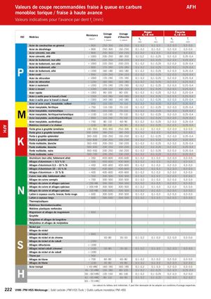 AFH Valeurs de coupe recommandées fraise à queue en carbure AFH monobloc torique / fraise à haute avance Valeurs indicatives pour l’avance par dent fz [mm] ISO Matériau Résistance Usinagemoyen Usinaged’ébauche[N/mm2]Vc [m/min]Vc [m/min]Moyend1=8 mmapfz[mm][mm] Ébauched1=8 mmapfz[mm][mm] Acier de construction en général < 800 250 - 300 150 - 250 0,1 - 0,2 0,1 - 0,3 0,2 - 0,3 0,3 - 0,5 Acier de décolletage < 800 250 - 300 150 - 250 0,1 - 0,2 0,1 - 0,3 0,2 - 0,3 0,3 - 0,5 Acier cémenté, non allié < 800 250 - 300 150 - 250 0,1 - 0,2 0,1 - 0,3 0,2 - 0,3 0,3 - 0,5 Acier cémenté, allié < 1000 200 - 250 180 - 200 0,1 0,2 0,1 - 0,25 0,2 - 0,3 0,25 - 0,4 Acier de traitement, non allié < 850 220 - 250 200 - 220 0,1 - 0,2 0,1 - 0,25 0,2 - 0,3 0,25 - 0,4 Acier de traitement, non allié < 1000 220 - 250 200 - 220 0,1 - 0,2 0,1 - 0,25 0,2 - 0,3 0,25 - 0,4 Acier de traitement, allié < 800 170 - 190 170 - 190 0,1 - 0,2 0,1 - 0,25 0,2 - 0,3 0,25 - 0,4 P Acier de traitement, alliéAcier coulé < 1300 160 - 180 160 - 180 0,1 - 0,2 0,1 - 0,25 0,2 - 0,3 0,25 - 0,4< 850220 - 250200 - 2200,1 - 0,20,1 - 0,250,2 - 0,30,25 - 0,4 Acier de nitruration < 1000 170 - 190 170 - 190 0,1 - 0,2 0,1 - 0,25 0,2 - 0,3 0,25 - 0,4 Acier de nitruration < 1200 160 - 180 160 - 180 0,1 - 0,2 0,1 - 0,25 0,2 - 0,3 0,25 - 0,4 Acier à roulement < 1200 170 - 190 170 - 190 0,1 0,2 0,1 - 0,25 0,2 - 0,3 0,25 - 0,4 Acier à ressort < 1200 100 - 120 100 - 120 0,1 - 0,2 0,1 - 0,25 0,2 - 0,3 0,25 - 0,4 Acier rapide < 1300 80 - 100 80 - 100 0,1 - 0,2 0,1 - 0,25 0,2 - 0,3 0,25 - 0,4 Acier à outils pour le travail à froid < 1300 140 - 180 140 - 180 0,1 - 0,2 0,1 - 0,25 0,2 - 0,3 0,25 - 0,4 Acier à outils pour le travail à chaud < 1300 140 - 180 140 - 180 0,1 0,2 0,1 - 0,25 0,2 - 0,3 0,25 - 0,4 Acier et acier coulé, inoxydable, sulfuré < 850 110 - 150 70 - 110 0,1 - 0,2 0,1 - 0,25 0,2 - 0,3 0,25 - 0,4 Acier inoxydable, ferritique < 750 110 - 150 70 - 110 0,1 - 0,2 0,1 - 0,25 0,2 - 0,3 0,25 - 0,4 M Acier inoxydable, martensitiqueAcier inoxydable, ferritique/martensitiqueAcier inoxydable, austénitique/ferritique< 900110 - 15070 - 110 0,1 - 0,2 0,1 - 0,25 0,2 - 0,3 0,25 - 0,4< 1100110 - 15070 - 1100,1 - 0,20,1 - 0,250,2 - 0,30,25 - 0,4< 850110 - 15070 - 1100,1 - 0,20,1 - 0,250,2 - 0,30,25 - 0,4 Acier inoxydable, austénitique < 750 80 - 110 60 - 90 0,1 - 0,2 0,1 - 0,25 0,2 - 0,3 0,25 - 0,4 Matériau résistant à la chaleur < 1100 80 - 110 60 - 90 0,1 - 0,2 0,1 - 0,25 0,2 - 0,3 0,25 - 0,4 Fonte grise à graphite lamellaire 100 - 350 300 - 350 250 - 300 0,1 - 0,2 0,1 - 0,3 0,2 - 0,3 0,3 - 0,5 Fonte grise à graphite lamellaire 300 - 1000 180 - 250 180 - 250 0,1 - 0,2 0,1 - 0,3 0,2 - 0,3 0,3 - 0,5 Fonte à graphite sphéroïdal 300 - 500 200 - 250 150 - 200 0,1 - 0,2 0,1 - 0,25 0,2 - 0,3 0,25 - 0,4 K Fonte à graphite sphéroïdalFonte malléable, blanche 550 - 800 200 - 250 150 - 200 0,1 - 0,2 0,1 - 0,25 0,2 - 0,3 0,25 - 0,4350 - 450200 - 250150 - 2000,1 - 0,20,1 - 0,250,2 - 0,30,25 - 0,4 Fonte malléable, blanche 500 - 650 200 - 250 150 - 200 0,1 - 0,2 0,1 - 0,25 0,2 - 0,3 0,25 - 0,4 Fonte malléable, noire 350 - 450 200 - 250 150 - 200 0,1 - 0,2 0,1 - 0,25 0,2 - 0,3 0,25 - 0,4 Fonte malléable, noire 500 - 700 200 - 250 150 - 200 0,1 - 0,2 0,1 - 0,25 0,2 - 0,3 0,25 - 0,4 Aluminium (non allié, faiblement allié) < 350 400 - 600 400 - 600 0,1 - 0,2 0,1 - 0,3 0,2 - 0,3 0,3 - 0,5 Alliages d’aluminium < 0,5 % Si < 500 400 - 600 400 - 600 0,1 - 0,2 0,1 - 0,3 0,2 - 0,3 0,3 - 0,5 Alliages d’aluminium 0,5 – 10 % Si < 400 400 - 600 400 - 600 0,1 - 0,2 0,1 - 0,3 0,2 - 0,3 0,3 - 0,5 Alliages d’aluminium 10 – 15 % Si < 400 400 - 600 400 - 600 0,1 - 0,2 0,1 - 0,3 0,2 - 0,3 0,3 - 0,5 Alliages d’aluminium > 15 % Si < 400 400 - 600 400 - 600 0,1 - 0,2 0,1 - 0,3 0,2 - 0,3 0,3 - 0,5 Cuivre (non allié, faiblement allié) < 350 300 - 500 300 - 500 0,1 - 0,2 0,1 - 0,3 0,2 - 0,3 0,3 - 0,5 Alliages de cuivre corroyés < 700 300 - 500 300 - 500 0,1 - 0,2 0,1 - 0,3 0,2 - 0,3 0,3 - 0,5 Alliages de cuivre et alliages spéciaux < 200 HB 300 - 500 300 - 500 0,1 - 0,2 0,1 - 0,3 0,2 - 0,3 0,3 - 0,5 N Alliages de cuivre et alliages spéciauxAlliages de cuivre et alliages spéciauxLaiton à copeaux courts, bronze, fonte rouge< 300 HB300 - 500300 - 5000,1 - 0,2 0,1 - 0,3 0,2 - 0,3 0,3 - 0,5> 300 HB300 - 500300 - 5000,1 - 0,20,1 - 0,30,2 - 0,30,3 - 0,5< 600300 - 500300 - 5000,1 - 0,20,1 - 0,30,2 - 0,30,3 - 0,5 Laiton à copeaux longs < 600 300 - 500 300 - 500 0,1 - 0,2 0,1 - 0,3 0,2 - 0,3 0,3 - 0,5 Thermoplastiques Matériaux thermodurcissables Matières plastiques renforcées Magnésium et alliages de magnésium < 850 Graphite Tungstène et alliages de tungstène Molybdène et alliages de molybdène Nickel pur Alliages de nickel Alliages de nickel < 850 Alliages de nickel et de chrome 50 - 80 30 - 50 0,1 - 0,2 0,1 - 0,3 0,2 - 0,3 0,3 - 0,5 S Alliages de nickel et de cobaltAlliages réfractairesAlliages nickel-cobalt (chrome)< 1300< 1300< 140050 - 80 30 - 50 0,1 - 0,2 0,1 - 0,3 0,2 - 0,3 0,3 - 0,5 Alliages de nickel et de cobalt < 1300 Titane pur < 900 Alliages de titane < 700 60 - 80 60 - 80 0,1 - 0,2 0,1 - 0,3 0,2 - 0,3 0,3 - 0,5 Alliages de titane < 1200 40 - 80 40 - 80 0,1 - 0,2 0,1 - 0,3 0,2 - 0,3 0,3 - 0,5 Acier trempé < 45 HRC 160 - 190 160 - 190 0,1 - 0,2 0,1 - 0,3 0,2 - 0,3 0,3 - 0,5 H 46 – 55 HRC 150 - 180 80 - 120 0,1 - 0,2 0,1 - 0,25 0,2 - 0,3 0,25 - 0,456 – 60 HRC120 - 15080 - 1000,1 - 0,20,1 - 0,250,2 - 0,30,2 - 0,361 – 65 HRC80 - 11060 - 900,1 - 0,20,1 - 0,250,2 - 0,30,2 - 0,3 65 – 70 HRC Les valeurs du tableau sont indicatives. Il peut être nécessaire de les adapter aux conditions d’usinage respectives. 222 VHM- / PM-HSS Werkzeuge | Solid carbide- / PM-HSS Tools | Outils carbure monobloc / PM-HSS