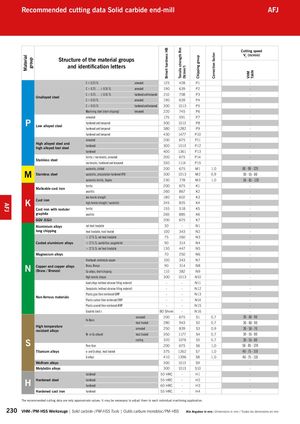 Material group Brinell hardness HB Tensile strength Rm (N/mm²) Chipping group Correction factor VHM TiAlN AFJ Recommended cutting data Solid carbide end-mill AFJ Cutting speed Structure of the material groups Vc (m/min) and identification letters C ≤ 0.25 % annealed 125 428 P1 - C > 0.25 … ≤ 0.55 % annealed 190 639 P2 - C > 0.25 … ≤ 0.55 % hardened and tempered 210 708 P3 - Unalloyed steel C > 0.55 % annealed 190 639 P4 - C > 0.55 % hardened and tempered 300 1013 P5 - Machining steel (short-chipping) tempered 220 745 P6 - annealed 175 591 P7 - P Low alloyed steel hardened and temperedhardened and tempered 300 1013 P8 -3801282P9- hardened and tempered 430 1477 P10 - annealed 200 675 P11 - High alloyed steel andhigh alloyed tool steelhardened 300 1013 P12 - hardened 400 1361 P13 - ferritic / martensitic, annealed 200 675 P14 - Stainless steel martensitic, hardened and tempered 330 1114 P15 - austenitic, chilled 200 675 M1 1,0 60 - 90 - 120 M Stainless steel austenitic, precipitation-hardened (PH) 300 1013 M2 0,9 30 - 55 - 80 austenitic-ferritic, Duplex 230 778 M3 1,0 50 - 85 - 120 ferritic 200 675 K1 - Malleable cast iron pearlitic 260 867 K2 - low tensile strength 180 602 K3 - K Cast iron high tensile strength / austenitic 245 825 K4 - Cast iron with nodular ferritic 155 518 K5 - graphite pearlitic 265 885 K6 - GGV (CGI) 200 675 K7 - Aluminium alloys not heat treatable 30 - N1 - long chipping heat treatable, heat treated 100 343 N2 - ≤ 12 % Si, not heat treatable 75 260 N3 - Casted aluminium alloys ≤ 12 % Si, aushärtbar, ausgehärtet 90 314 N4 - > 12 % Si, not heat treatable 130 447 N5 - Magnesium alloys 70 250 N6 - Unalloyed, elektrolyte copper 100 343 N7 - N Copper and copper alloys(Brass / Bronze)Brass, BronzeCu-alloys, short-chipping 90 314 N8 -110382N9- High-tensile, Ampco 300 1013 N10 - Lead alloys (without abrasive filling material) - - N11 - Duroplastic (without abrasive filling material) - - N12 - Plastic glas fibre reinforced GFRP - - N13 - Non-ferrous materials Plastic carbon fibre reinforced CFRP - - N14 - Plastic aramid fibre reinforced AFRP - - N15 - Graphite (tech.) 80 Shore - N16 - annealed 200 675 S1 0,7 30 - 60 - 90 Fe-Basis heat treated 280 943 S2 0,7 30 - 60 - 90 High temperatureresistant alloys annealed 250 839 S3 0,9 30 - 50 - 70 Ni- or Co-alloyed heat treated 350 1177 S4 0,7 30 - 55 - 80 S casting 320 1076 S5 0,7 30 - 55 - 80Pure titan200675S61,050 - 85 - 120 Titanium alloys α- and β-alloys, heat treated 375 1262 S7 1,0 40 - 75 - 110 β-alloys 410 1396 S8 1,0 40 - 75 - 110 Wolfram alloys 300 1013 S9 - Molybdän alloys 300 1013 S10 - hardened 50 HRC - H1 - H Hardened steel hardenedhardened 55 HRC - H2 -60 HRC-H3- Hardened cast iron hardened 55 HRC - H4 - The recommended cutting data are only approximate values. It may be necessary to adjust them to each individual machining application. 230 VHM- / PM-HSS Werkzeuge | Solid carbide- / PM-HSS Tools | Outils carbure monobloc / PM-HSS Alle Angaben in mm / Dimensions in mm / Toutes les dimensions en mm