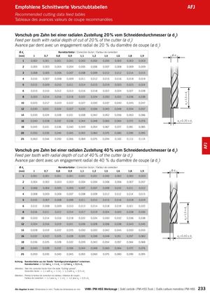 ap=1,5 x d1ap=1,5 x d1 AFJ Empfohlene Schnittwerte Vorschubtabellen AFJ Recommended cutting data feed tables Tableaux des avances valeurs de coupe recommandées Vorschub pro Zahn bei einer radialen Zustellung 20 % vom Schneidendurchmesser (ø d1) Feed per tooth with radial depth of cut of 20 % of the cutter (ø d1) Avance par dent avec un engagement radial de 20 % du diamètre de coupe (ø d1) Ø d1 Korrekturfaktor / Correction factor / Facteur de correction [mm] 1 0,7 0,8 0,9 1,1 1,2 1,5 1,6 1,8 1,9 Ø d1 1 0,002 0,001 0,001 0,001 0,002 0,002 0,003 0,003 0,003 0,003 2 0,005 0,003 0,004 0,004 0,005 0,006 0,007 0,008 0,009 0,009 3 0,008 0,005 0,006 0,007 0,008 0,009 0,012 0,012 0,014 0,015 4 0,010 0,007 0,008 0,009 0,011 0,012 0,015 0,016 0,018 0,019 5 0,013 0,009 0,010 0,011 0,014 0,015 0,019 0,020 0,023 0,024 6 0,015 0,010 0,012 0,013 0,016 0,018 0,022 0,024 0,027 0,028 8 0,020 0,014 0,016 0,018 0,022 0,024 0,030 0,032 0,036 0,038 10 0,025 0,017 0,020 0,022 0,027 0,030 0,037 0,040 0,045 0,047 12 0,030 0,021 0,024 0,027 0,033 0,036 0,045 0,048 0,054 0,057 14 0,035 0,024 0,028 0,031 0,038 0,042 0,052 0,056 0,063 0,066 16 0,040 0,028 0,032 0,036 0,044 0,048 0,060 0,064 0,072 0,076 ae=0,20 x d1 18 0,045 0,031 0,036 0,040 0,049 0,054 0,067 0,072 0,081 0,085 20 0,050 0,035 0,040 0,045 0,055 0,060 0,075 0,080 0,090 0,095 25 0,063 0,044 0,050 0,056 0,069 0,075 0,094 0,100 0,113 0,119 Vorschub pro Zahn bei einer radialen Zustellung 40 % vom Schneidendurchmesser (ø d1) Feed per tooth with radial depth of cut of 40 % of the cutter (ø d1) Avance par dent avec un engagement radial de 40 % du diamètre de coupe (ø d1) Ø d1 Korrekturfaktor / Correction factor / Facteur de correction [mm] 1 0,7 0,8 0,9 1,1 1,2 1,5 1,6 1,8 1,9 Ø d1 1 0,001 0,001 0,001 0,001 0,001 0,001 0,002 0,002 0,002 0,003 2 0,004 0,002 0,003 0,003 0,004 0,004 0,006 0,006 0,007 0,007 3 0,006 0,004 0,005 0,005 0,007 0,007 0,009 0,010 0,011 0,012 4 0,008 0,005 0,006 0,007 0,008 0,009 0,012 0,012 0,014 0,015 5 0,010 0,007 0,008 0,009 0,011 0,012 0,015 0,016 0,018 0,019 6 0,012 0,008 0,009 0,010 0,013 0,014 0,018 0,019 0,021 0,022 8 0,016 0,011 0,012 0,014 0,017 0,019 0,024 0,025 0,028 0,030 10 0,020 0,014 0,016 0,018 0,022 0,024 0,030 0,032 0,036 0,038 12 0,024 0,016 0,019 0,021 0,026 0,028 0,036 0,038 0,043 0,045 14 0,028 0,019 0,022 0,025 0,030 0,033 0,042 0,044 0,050 0,053 16 0,032 0,022 0,025 0,028 0,035 0,038 0,048 0,051 0,057 0,060 ae=0,40 x d1 18 0,036 0,025 0,028 0,032 0,039 0,043 0,054 0,057 0,064 0,068 20 0,040 0,028 0,032 0,036 0,044 0,048 0,060 0,064 0,072 0,076 25 0,050 0,035 0,040 0,045 0,055 0,060 0,075 0,080 0,090 0,095 Achtung: Korrekturfaktor aus der Tabelle “Schnittgeschwindigkeiten” entnehmen. Korrekturfaktor -> 1,1 bei ap = 1 x d1 -> 1,2 bei ap = 0,5 x d1 Attention: Take the correction factor from the table “Cutting speeds”. Correction factor -> 1,1 with ap = 1 x d1 -> 1,2 with ap = 0,5 x d1 Attention : Prenez le facteur de correction du tableau «Vitesses de coupe». Facteur de correction -> 1,1 pour ap = 1 x d1 -> 1,2 pour ap = 0,5 x d1 Alle Angaben in mm / Dimensions in mm / Toutes les dimensions en mm VHM- / PM-HSS Werkzeuge | Solid carbide- / PM-HSS Tools | Outils carbure monobloc / PM-HSS 233