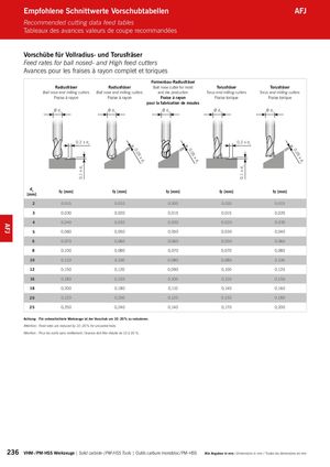 0,1 x d1 0,1 x d1 AFJ 0,05 x d 1 0,05 x d 1 0,05 x d 1 Empfohlene Schnittwerte Vorschubtabellen AFJ Recommended cutting data feed tables Tableaux des avances valeurs de coupe recommandées Vorschübe für Vollradius- und Torusfräser Feed rates for ball nosed- and High feed cutters Avances pour les fraises à rayon complet et toriques Formenbau-Radiusfräser Radiusfräser Radiusfräser Ball nose cutter for mold Torusfräser Torusfräser Ball nose end milling cutters Ball nose end milling cutters and die production Torus end milling cutters Torus end milling cutters Fraise à rayon Fraise à rayon Fraise à rayon Fraise torique Fraise torique pour la fabrication de moules Ø d1 Ø d1 Ø d1 Ø d1 Ø d1 0,2 x d1 0,2 x d1 d1[mm] fz [mm] fz [mm] fz [mm] fz [mm] fz [mm] 2 0,015 0,010 0,005 0,010 0,015 3 0,030 0,020 0,015 0,015 0,020 4 0,040 0,030 0,030 0,020 0,030 5 0,060 0,050 0,050 0,030 0,040 6 0,070 0,060 0,060 0,050 0,060 8 0,100 0,080 0,070 0,070 0,080 10 0,120 0,100 0,080 0,080 0,100 12 0,150 0,120 0,090 0,100 0,120 16 0,180 0,150 0,100 0,120 0,150 18 0,200 0,180 0,110 0,140 0,160 20 0,220 0,200 0,120 0,150 0,180 25 0,250 0,240 0,140 0,170 0,200 Achtung: Für unbeschichtete Werkzeuge ist der Vorschub um 10 - 20 % zu reduzieren. Attention: Feed rates are reduced by 10 - 20 % for uncoated tools. Attention : Pour les outils sans revêtement, l’avance doit être réduite de 10 à 20 %. 236 VHM- / PM-HSS Werkzeuge | Solid carbide- / PM-HSS Tools | Outils carbure monobloc / PM-HSS Alle Angaben in mm / Dimensions in mm / Toutes les dimensions en mm