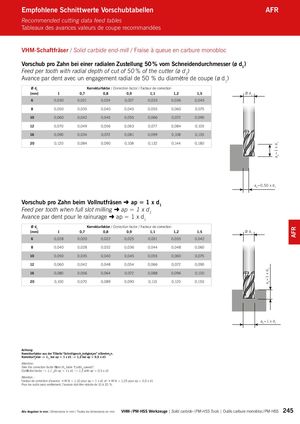 ap=1 x d1 ap=1 x d1 AFR Empfohlene Schnittwerte Vorschubtabellen AFR Recommended cutting data feed tables Tableaux des avances valeurs de coupe recommandées VHM-Schaftfräser / Solid carbide end-mill / Fraise à queue en carbure monobloc Vorschub pro Zahn bei einer radialen Zustellung 50 % vom Schneidendurchmesser (ø d1) Feed per tooth with radial depth of cut of 50 % of the cutter (ø d1) Avance par dent avec un engagement radial de 50 % du diamètre de coupe (ø d1) Ø d1 Korrekturfaktor / Correction factor / Facteur de correction [mm] 1 0,7 0,8 0,9 1,1 1,2 1,5 Ø d1 6 0,030 0,021 0,024 0,027 0,033 0,036 0,045 8 0,050 0,035 0,040 0,045 0,055 0,060 0,075 10 0,060 0,042 0,045 0,055 0,066 0,072 0,090 12 0,070 0,049 0,056 0,063 0,077 0,084 0,105 16 0,090 0,034 0,072 0,081 0,099 0,108 0,135 20 0,120 0,084 0,090 0,108 0,132 0,144 0,180 ae=0,50 x d1 Vorschub pro Zahn beim Vollnutfräsen ➜ ap = 1 x d1 Feed per tooth when full slot milling ➜ ap = 1 x d1 Avance par dent pour le rainurage ➜ ap = 1 x d1 Ø d1 Korrekturfaktor / Correction factor / Facteur de correction [mm] 1 0,7 0,8 0,9 1,1 1,2 1,5 Ø d1 6 0,028 0,020 0,022 0,025 0,031 0,035 0,042 8 0,040 0,028 0,032 0,036 0,044 0,048 0,060 10 0,050 0,035 0,040 0,045 0,055 0,060 0,075 12 0,060 0,042 0,048 0,054 0,066 0,072 0,090 16 0,080 0,056 0,064 0,072 0,088 0,096 0,120 20 0,100 0,070 0,089 0,090 0,110 0,120 0,150 ae=1 x d1 Achtung: Korrekturfaktor aus der Tabelle “Schnittgeschwindigkeiten” entnehmen. Korrekturfaktor -> 1,1 bei ap = 1 x d1 -> 1,2 bei ap = 0,5 x d1 Attention: Take the correction factor from the table “Cutting speeds”. Correction factor -> 1,1 with ap = 1 x d1 -> 1,2 with ap = 0,5 x d1 Attention : Facteur de correction d’avance ➝ Kf fz = 1,10 pour ap = 1 x d1 et ➝ Kf fz = 1,25 pour ap = 0,5 x d1 Pour les outils sans revêtement, l’avance doit être réduite de 10 à 20 %. Alle Angaben in mm / Dimensions in mm / Toutes les dimensions en mm VHM- / PM-HSS Werkzeuge | Solid carbide- / PM-HSS Tools | Outils carbure monobloc / PM-HSS 245