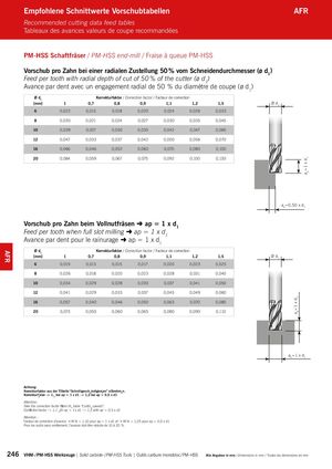 ap=1 x d1 ap=1 x d1 Empfohlene Schnittwerte Vorschubtabellen AFR Recommended cutting data feed tables Tableaux des avances valeurs de coupe recommandées PM-HSS Schaftfräser / PM-HSS end-mill / Fraise à queue PM-HSS Vorschub pro Zahn bei einer radialen Zustellung 50 % vom Schneidendurchmesser (ø d1) Feed per tooth with radial depth of cut of 50 % of the cutter (ø d1) Avance par dent avec un engagement radial de 50 % du diamètre de coupe (ø d1) Ø d1 Korrekturfaktor / Correction factor / Facteur de correction [mm] 1 0,7 0,8 0,9 1,1 1,2 1,5 Ø d1 6 0,022 0,015 0,018 0,020 0,024 0,026 0,033 8 0,030 0,021 0,024 0,027 0,030 0,035 0,045 10 0,039 0,027 0,030 0,035 0,042 0,047 0,060 12 0,047 0,033 0,037 0,042 0,050 0,056 0,070 16 0,066 0,046 0,052 0,060 0,070 0,080 0,100 20 0,084 0,059 0,067 0,075 0,092 0,100 0,130 ae=0,50 x d1 Vorschub pro Zahn beim Vollnutfräsen ➜ ap = 1 x d1 Feed per tooth when full slot milling ➜ ap = 1 x d1 Avance par dent pour le rainurage ➜ ap = 1 x d1 Ø d1 Korrekturfaktor / Correction factor / Facteur de correction [mm] 1 0,7 0,8 0,9 1,1 1,2 1,5 Ø d1 6 0,019 0,013 0,015 0,017 0,020 0,023 0,025 8 0,026 0,018 0,020 0,023 0,028 0,031 0,040 10 0,034 0,029 0,028 0,030 0,037 0,041 0,050 12 0,041 0,029 0,033 0,037 0,045 0,049 0,060 16 0,057 0,040 0,046 0,050 0,063 0,070 0,080 20 0,073 0,050 0,060 0,065 0,080 0,090 0,110 ae=1 x d1 Achtung: Korrekturfaktor aus der Tabelle “Schnittgeschwindigkeiten” entnehmen. Korrekturfaktor -> 1,1 bei ap = 1 x d1 -> 1,2 bei ap = 0,5 x d1 Attention: Take the correction factor from the table “Cutting speeds”. Correction factor -> 1,1 with ap = 1 x d1 -> 1,2 with ap = 0,5 x d1 Attention : Facteur de correction d’avance ➝ Kf fz = 1,10 pour ap = 1 x d1 et ➝ Kf fz = 1,25 pour ap = 0,5 x d1 Pour les outils sans revêtement, l’avance doit être réduite de 10 à 20 %. 246 VHM- / PM-HSS Werkzeuge | Solid carbide- / PM-HSS Tools | Outils carbure monobloc / PM-HSS Alle Angaben in mm / Dimensions in mm / Toutes les dimensions en mm AFR