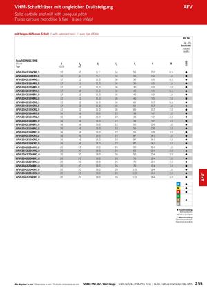 S100 AFV VHM-Schaftfräser mit ungleicher Drallsteigung AFV Solid carbide end-mill with unequal pitch Fraise carbure monobloc à tige - à pas inégal mit freigeschliffenem Schaft / with extended neck / avec tige affûtée PG 24 268 – 275 beschichtet coated revêtu Schaft DIN 6535HB Shank d dA d3 l1 l2 l R Tige -0,03 h6 AFV62342-100CR0,5 10 10 9,2 14 55 102 0,5 AFV62342-100CR1,0 10 10 9,2 14 55 102 1,0 AFV62342-120AR0,5 12 12 11,0 16 30 83 0,5 AFV62342-120AR1,0 12 12 11,0 16 30 83 1,0 AFV62342-120AR2,0 12 12 11,0 16 30 83 2,0 AFV62342-120BR0,5 12 12 11,0 16 40 93 0,5 AFV62342-120BR1,0 12 12 11,0 16 40 93 1,0 AFV62342-120BR2,0 12 12 11,0 16 40 93 2,0 AFV62342-120CR0,5 12 12 11,0 16 64 117 0,5 AFV62342-120CR1,0 12 12 11,0 16 64 117 1,0 AFV62342-120CR2,0 12 12 11,0 16 64 117 2,0 AFV62342-160AR1,0 16 16 15,0 22 38 92 1,0 AFV62342-160AR2,0 16 16 15,0 22 38 92 2,0 AFV62342-160AR3,0 16 16 15,0 22 38 92 3,0 AFV62342-160BR1,0 16 16 15,0 22 55 109 1,0 AFV62342-160BR2,0 16 16 15,0 22 55 109 2,0 AFV62342-160BR3,0 16 16 15,0 22 55 109 3,0 AFV62342-160CR1,0 16 16 15,0 22 87 141 1,0 AFV62342-160CR2,0 16 16 15,0 22 87 141 2,0 AFV62342-160CR3,0 16 16 15,0 22 87 141 3,0 AFV62342-200AR1,0 20 20 19,0 26 50 104 1,0 AFV62342-200AR2,0 20 20 19,0 26 50 104 2,0 AFV62342-200AR3,0 20 20 19,0 26 50 104 3,0 AFV62342-200BR1,0 20 20 19,0 26 70 124 1,0 AFV62342-200BR2,0 20 20 19,0 26 70 124 2,0 AFV62342-200BR3,0 20 20 19,0 26 70 124 3,0 AFV62342-200CR1,0 20 20 19,0 26 110 164 1,0 AFV62342-200CR2,0 20 20 19,0 26 110 164 2,0 AFV62342-200CR3,0 20 20 19,0 26 110 164 3,0 Hauptanwendung Main application Application principale Nebenanwendung Secondary application Application secondaire Alle Angaben in mm / Dimensions in mm / Toutes les dimensions en mm VHM- / PM-HSS Werkzeuge | Solid carbide- / PM-HSS Tools | Outils carbure monobloc / PM-HSS 255