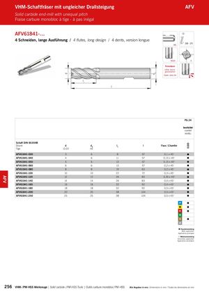 d dA S100 l VHM-Schaftfräser mit ungleicher Drallsteigung AFV Solid carbide end-mill with unequal pitch Fraise carbure monobloc à tige - à pas inégal AFV61841-… 4 Schneiden, lange Ausführung / 4 flutes, long design / 4 dents, version longue HB 268 – 275 Multi 4 Feinstkorn Ultra micro granulation Grain ultra fin l1 PG 24 beschichtet coated revêtu Schaft DIN 6535HB Shank d dA l1 l Fase / Chamfer Tige -0,03 h6 AFV61841-030 3 6 8 57 0,1 x 45° AFV61841-040 4 6 11 57 0,15 x 45° AFV61841-050 5 6 13 57 0,15 x 45° AFV61841-060 6 6 13 57 0,2 x 45° AFV61841-080 8 8 19 63 0,2 x 45° AFV61841-100 10 10 22 72 0,3 x 45° AFV61841-120 12 12 26 83 0,35 x 45° AFV61841-140 14 14 26 83 0,4 x 45° AFV61841-160 16 16 32 92 0,4 x 45° AFV61841-180 18 18 32 92 0,5 x 45° AFV61841-200 20 20 38 104 0,5 x 45° AFV61841-250 25 25 38 104 0,5 x 45° Hauptanwendung Main application Application principale Nebenanwendung Secondary application Application secondaire 256 VHM- / PM-HSS Werkzeuge | Solid carbide- / PM-HSS Tools | Outils carbure monobloc / PM-HSS Alle Angaben in mm / Dimensions in mm / Toutes les dimensions en mm AFV