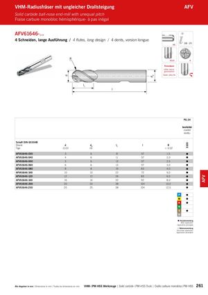 d dA S100 AFV I VHM-Radiusfräser mit ungleicher Drallsteigung AFV Solid carbide ball-nose end-mill with unequal pitch Fraise carbure monobloc hémisphérique- à pas inégal AFV61646-... 4 Schneiden, lange Ausführung / 4 flutes, long design / 4 dents, version longue HB 268 – 275 R Multi 4 Feinstkorn Ultra micro granulation Grain ultra fin I1 PG 24 beschichtet coated revêtu Schaft DIN 6535HB Shank d dA l1 l R Tige -0,03 h6 ± 0,02 AFV61646-030 3 6 8 57 1,5 AFV61646-040 4 6 11 57 2,0 AFV61646-050 5 6 13 57 2,5 AFV61646-060 6 6 13 57 3,0 AFV61646-080 8 8 19 63 4,0 AFV61646-100 10 10 22 72 5,0 AFV61646-120 12 12 26 83 6,0 AFV61646-160 16 16 32 92 8,0 AFV61646-200 20 20 38 104 10,0 AFV61646-250 25 25 38 104 12,5 Hauptanwendung Main application Application principale Nebenanwendung Secondary application Application secondaire Alle Angaben in mm / Dimensions in mm / Toutes les dimensions en mm VHM- / PM-HSS Werkzeuge | Solid carbide- / PM-HSS Tools | Outils carbure monobloc / PM-HSS 261